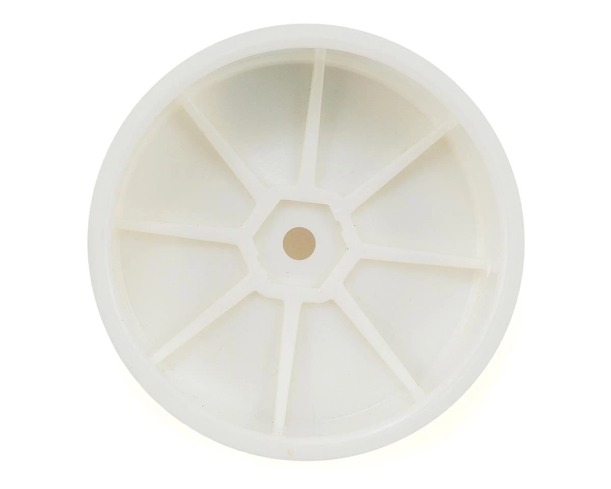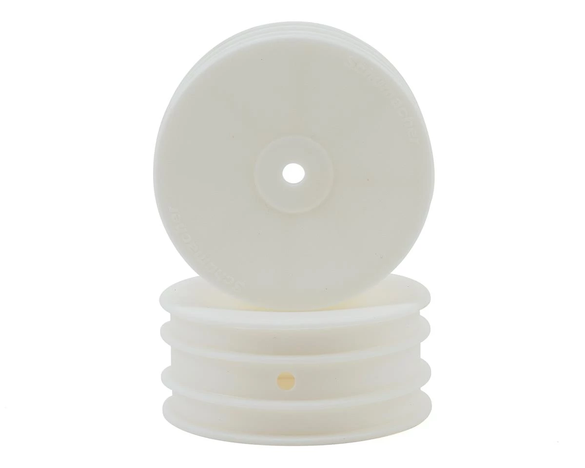 A package of two Schumacher 1/10 4WD 2.2 Buggy Front White Wheels. Each wheel features two vent holes.