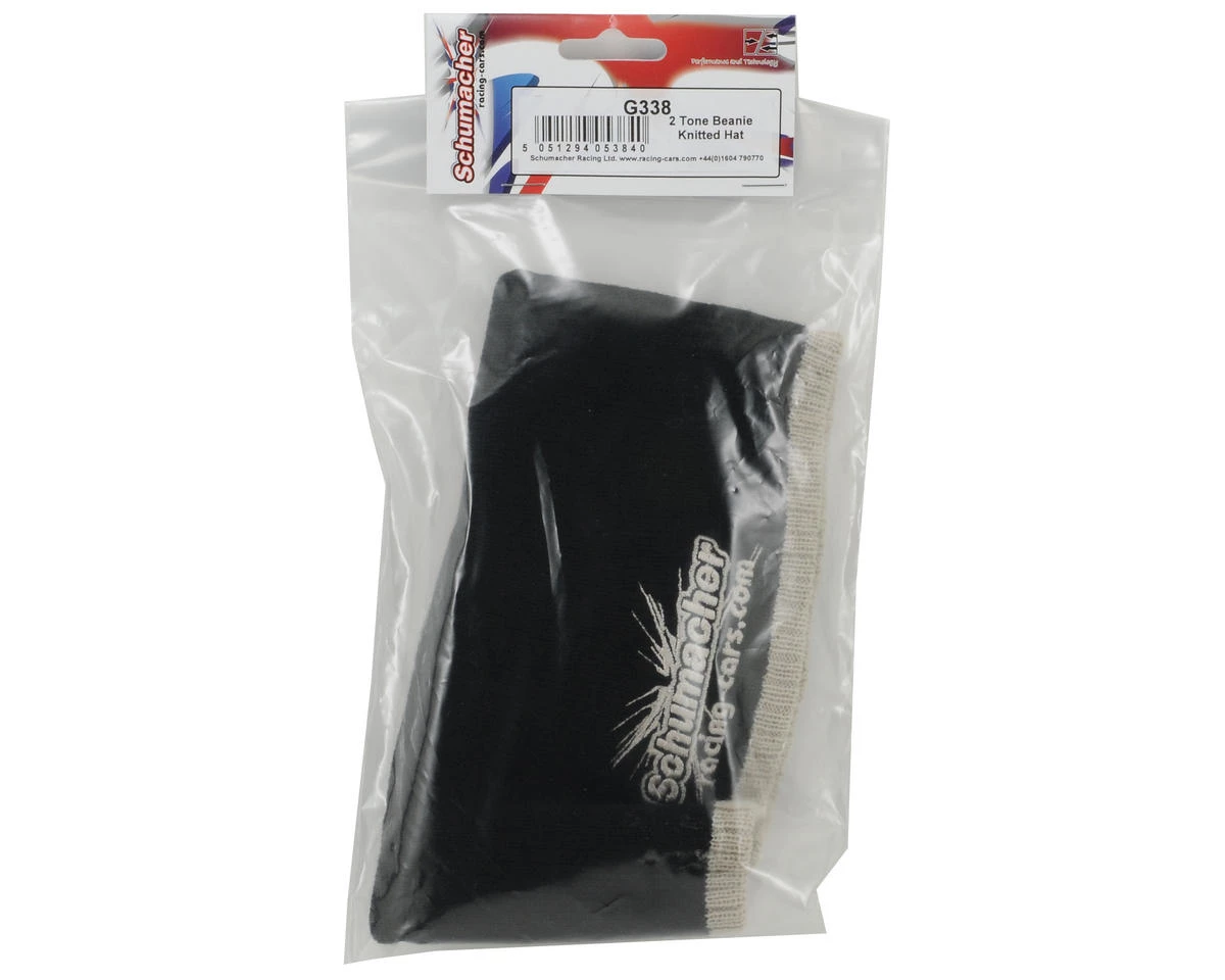 This is the Schumacher 2 Tone Beanie. This black beanie features the Schumacher logo, and web address embroidered on the front in white, with a cream colored rim around the bottom.