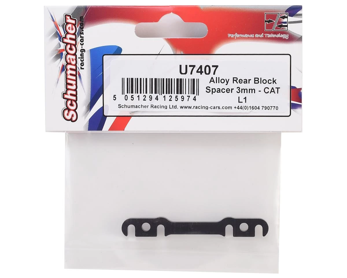 This is a replacement Schumacher 3mm Aluminum Alloy CAT L1 Rear Block Spacer.