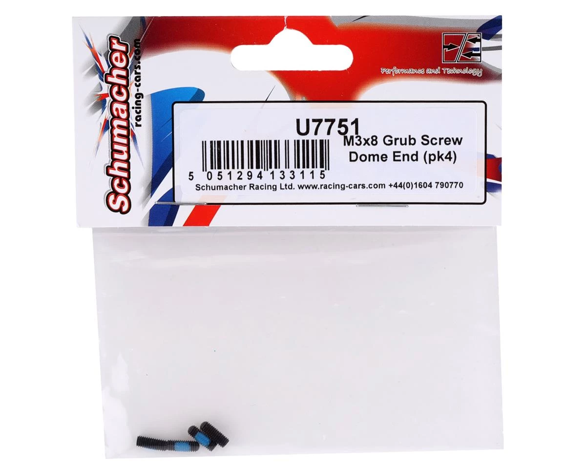 Schumacher 3x8mm Grub Screws. These dome ended grub screws are intended for the Schumacher Mi7. Package includes four grub screws.