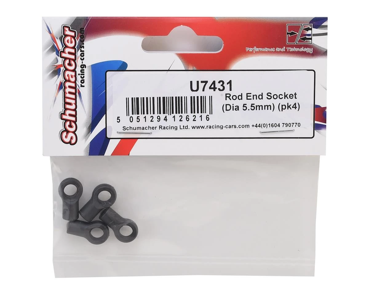 This is a pack of four replacement Schumacher 5.5mm CAT L1 Rod End Sockets, intended for use with the Schumacher 5.5mm pillow balls.