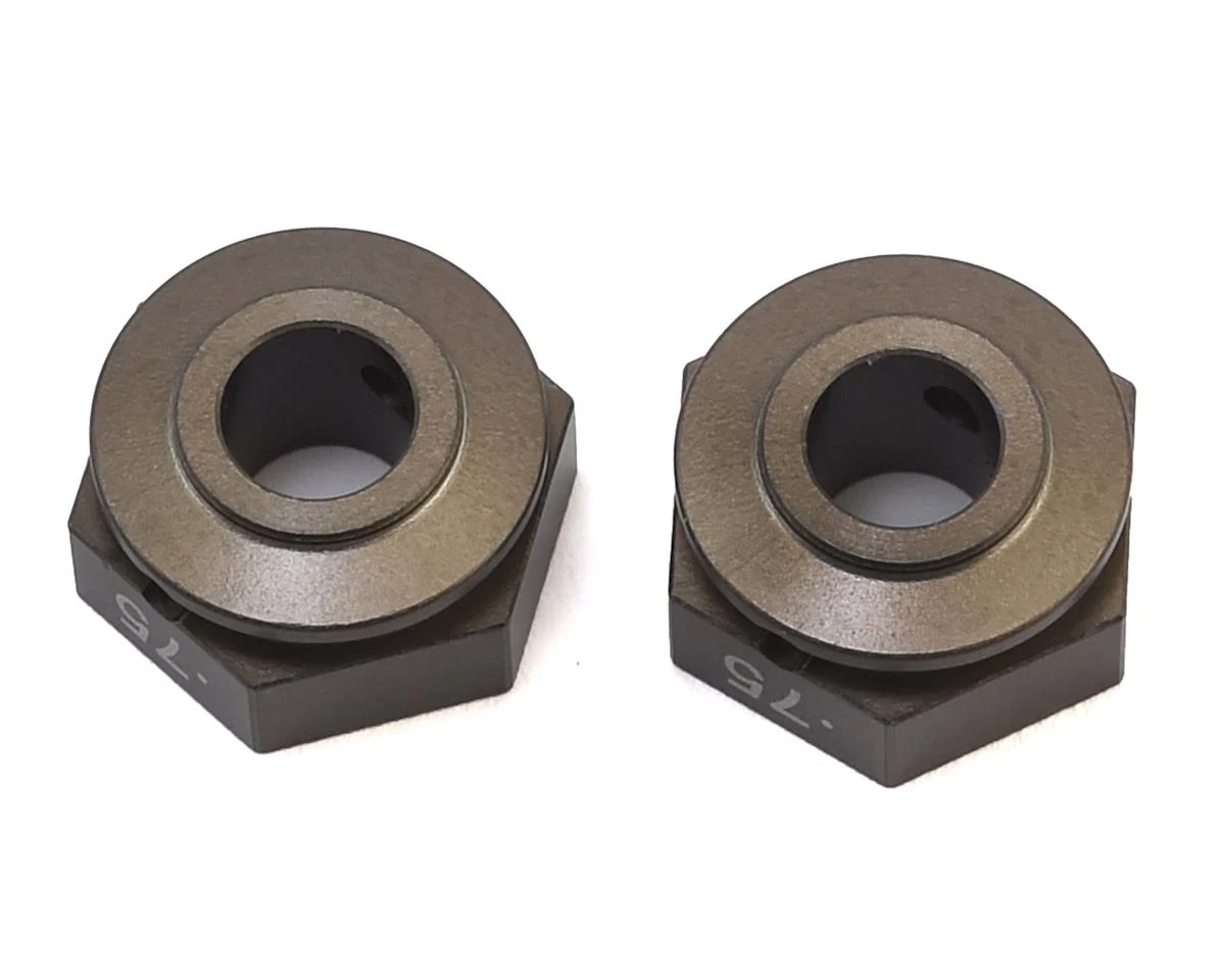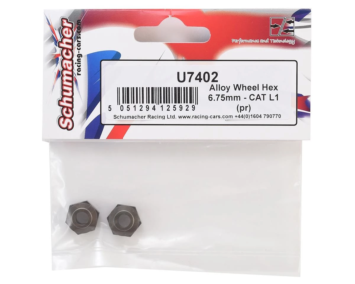This is a pack of two optional Schumacher 6.75mm Aluminum Alloy Wheel Hexes. These hexes provide an +0.75mm increase to the width per side.