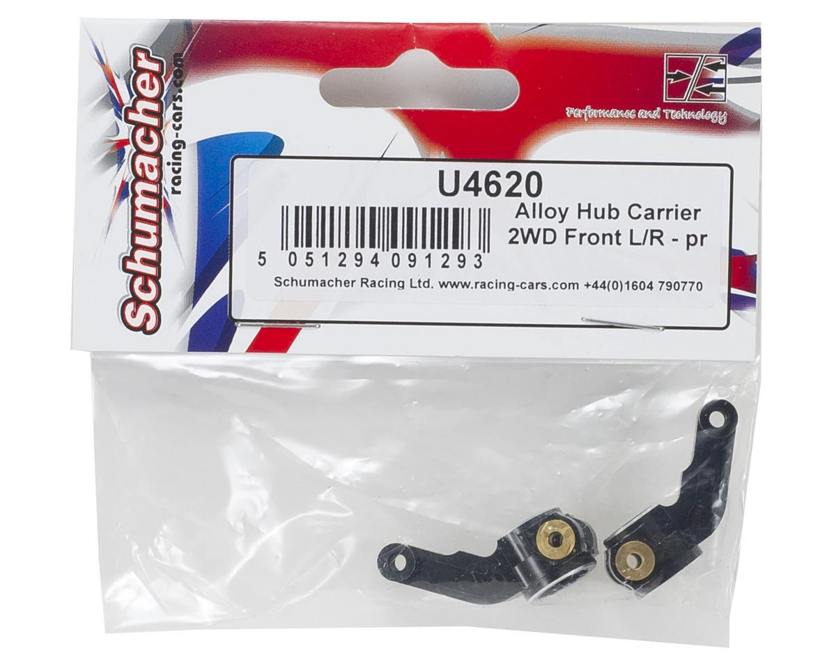 This is a pack of two optional Schumacher Racing Aluminum Front Hub Carriers. Package includes a left and right side.