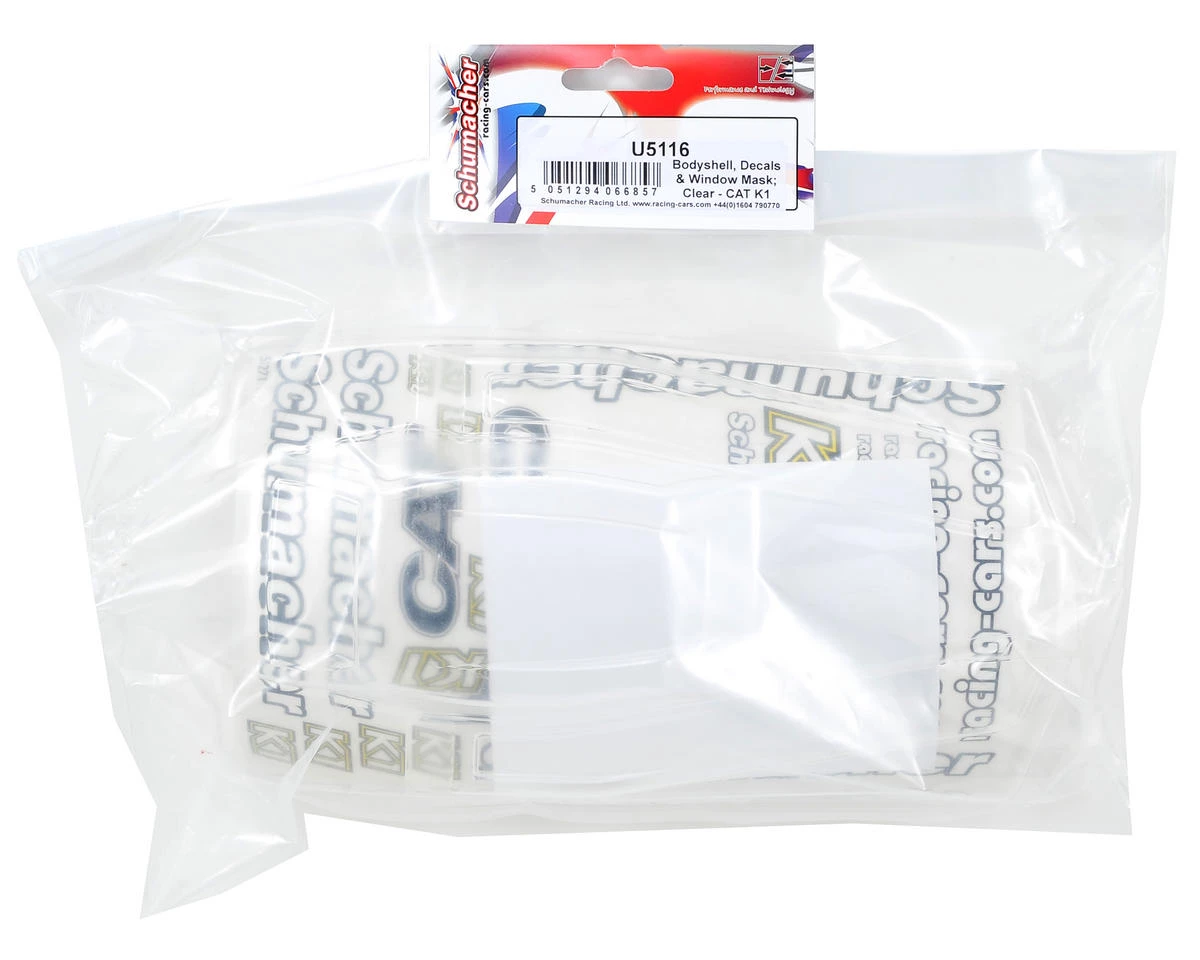 This is a replacement Schumacher Clear Body, and is intended for use with the Schumacher CAT K1 1/10 scale 4WD buggy. This body also includes a decal sheet and window masks.