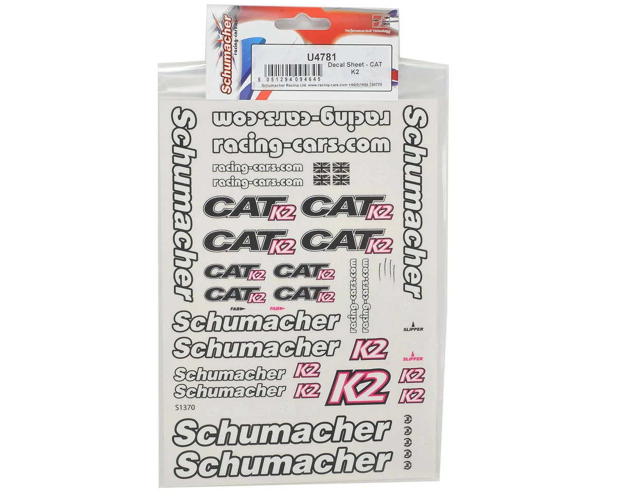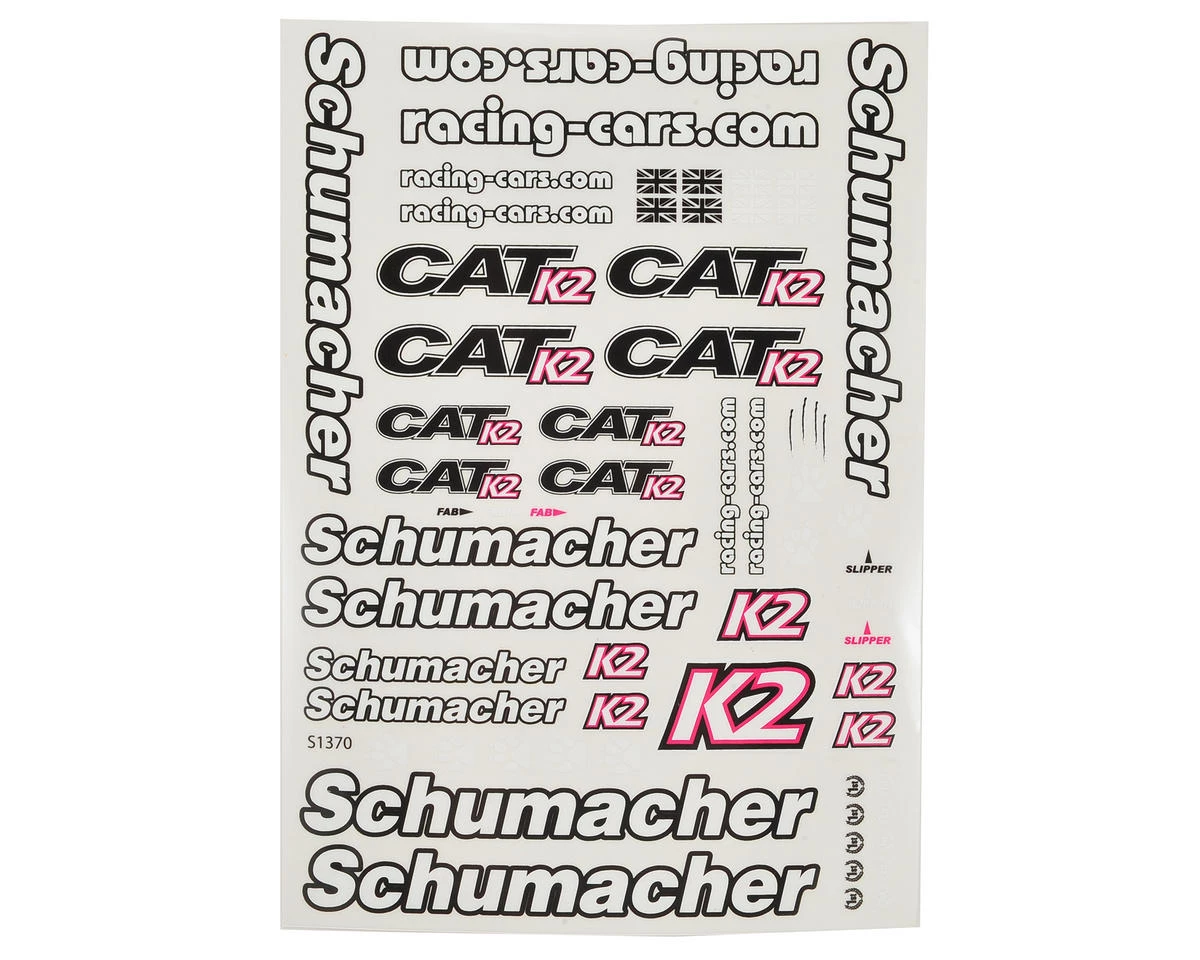 The Schumacher CAT K2 Decal Sheet is a fantastic addition to my RC car. The decals are high-quality and easy to apply. They really enhance the look of my car!