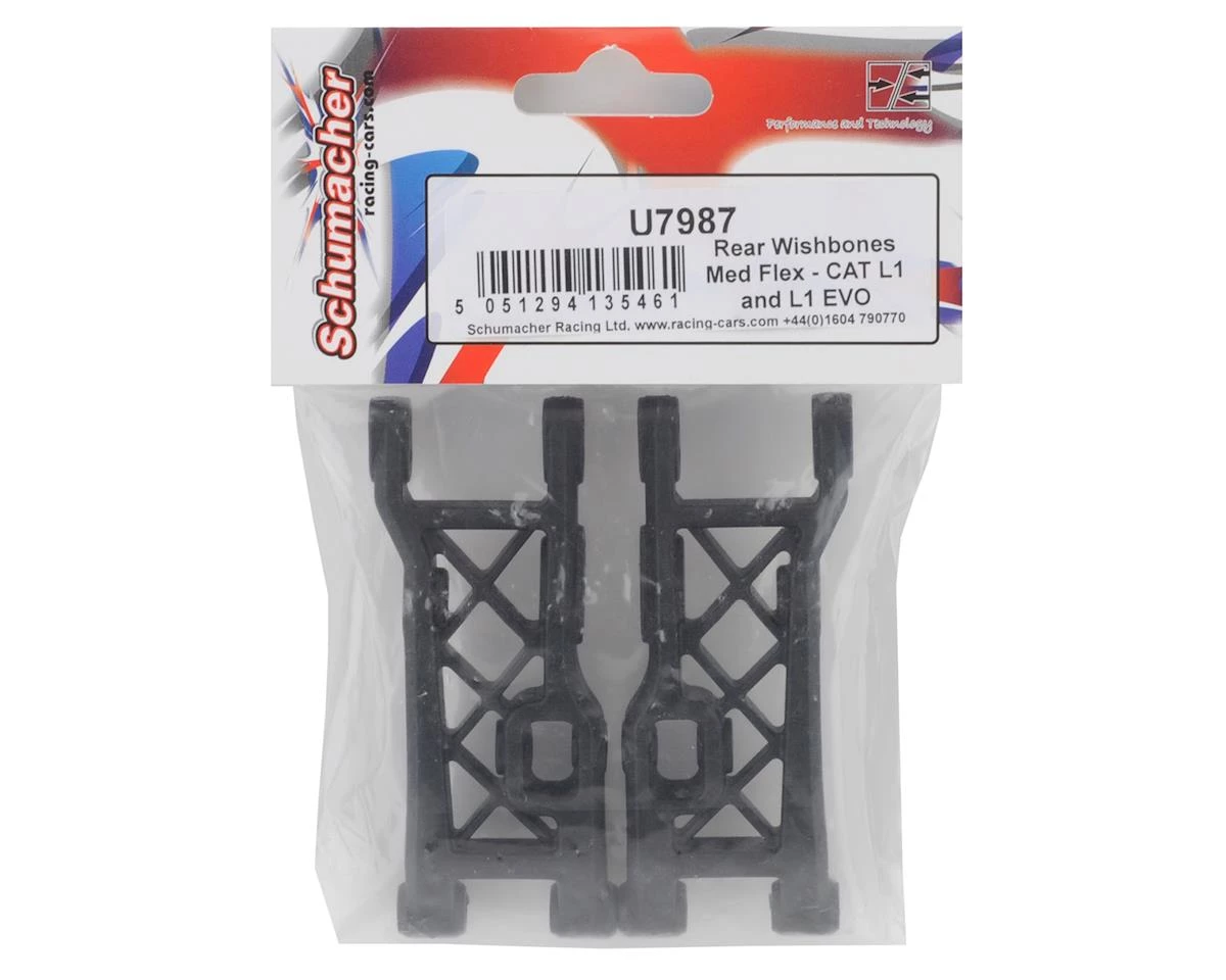 This is a replacement set of Schumacher CAT L1 and L1 EVO Medium Flex Rear Wishbones, intended for use with the CAT L1 EVO 1/10 4WD Off-Road Buggy Kit.