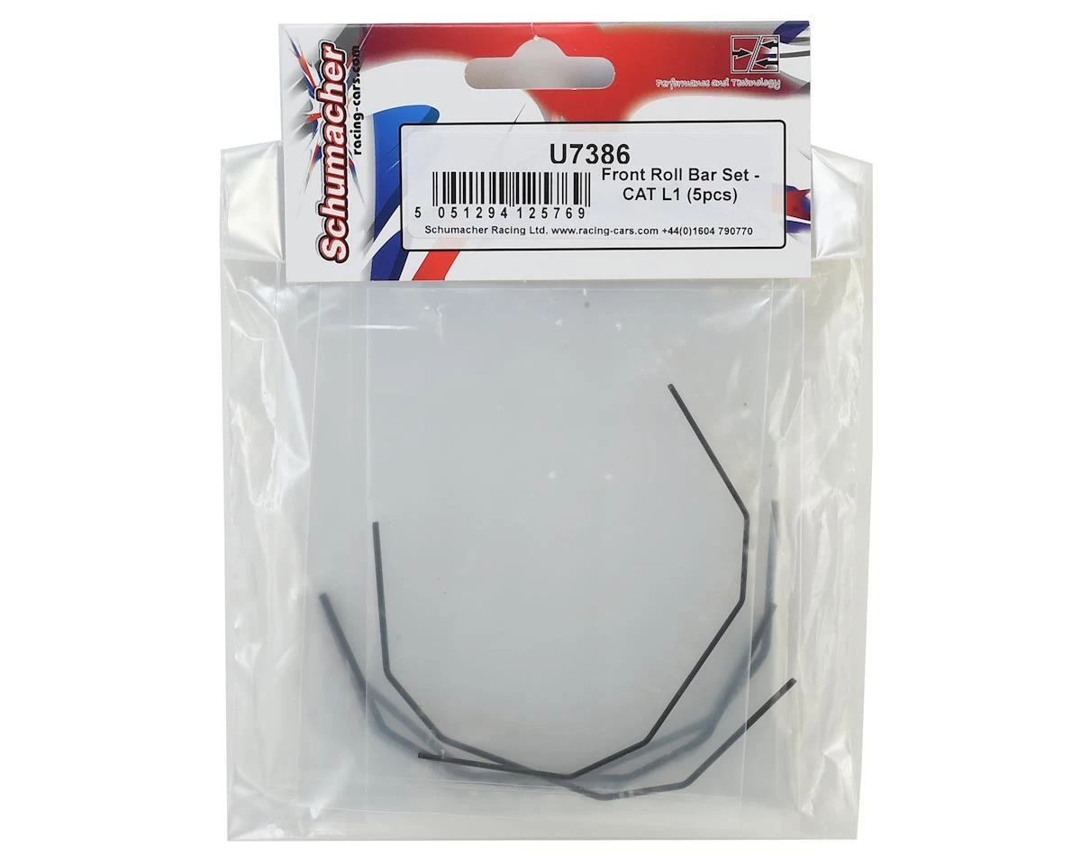 Schumacher Front Roll Bar Set. This is the optional front roll bar tuning kit. Package includes five roll bar wires you can use to tune your chassis to a variety of track conditions.