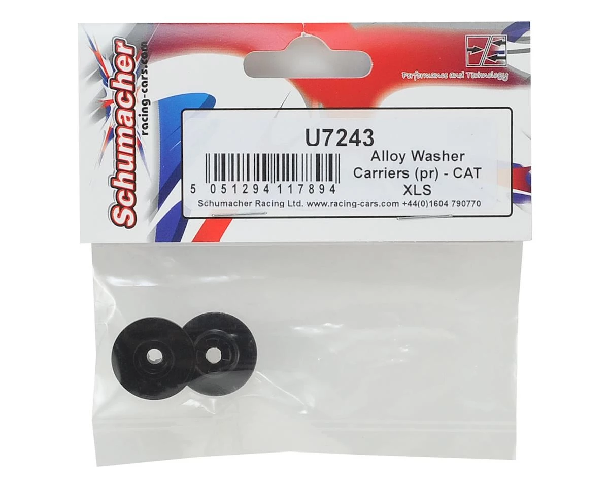 This is a pack of two replacement Schumacher RC CAT XLS Alloy Washer Carriers.