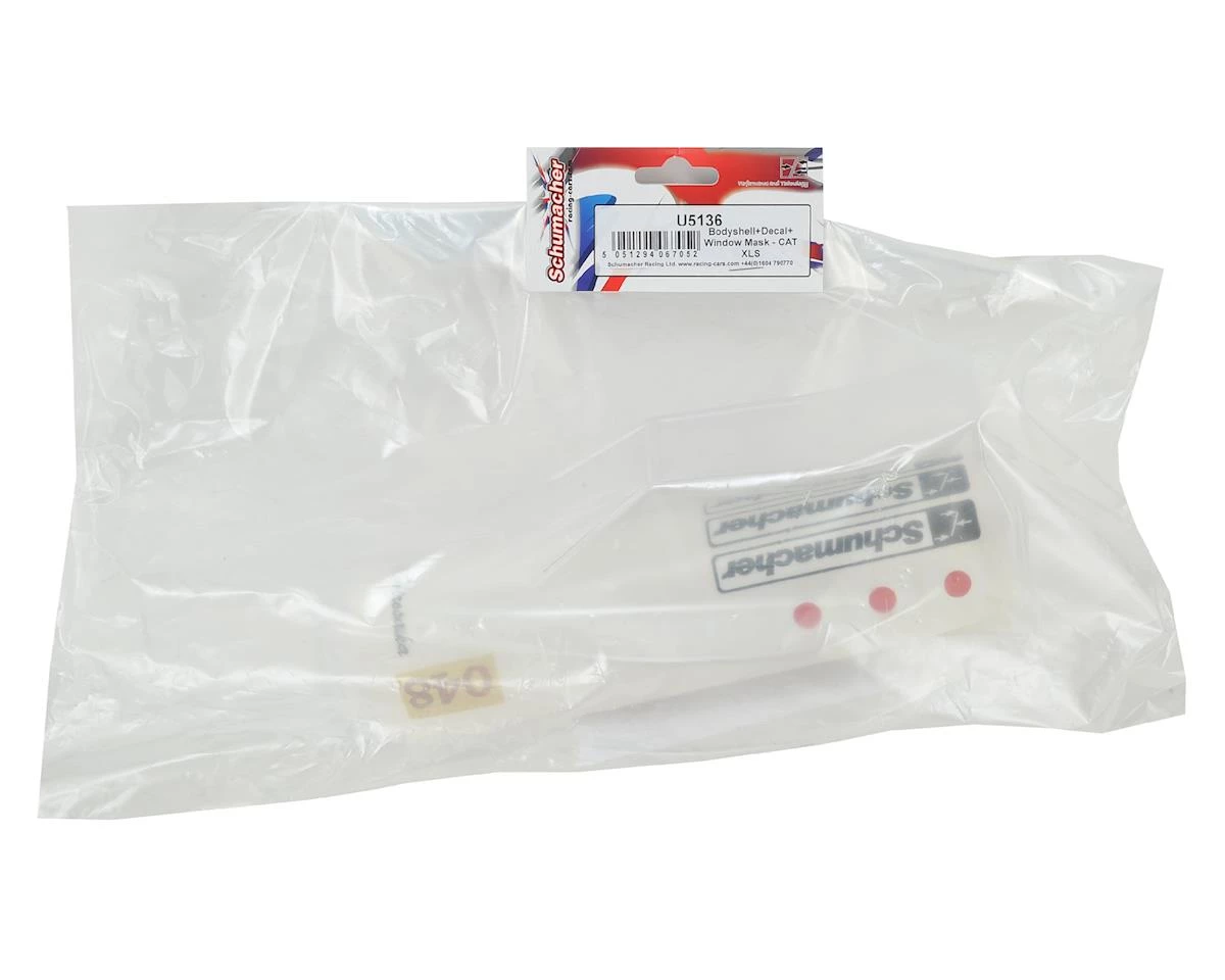 Schumacher CAT XLS Body. This is the replacement clear polycarbonate body, with window masks and decal sheet. Requires paint and trimming.