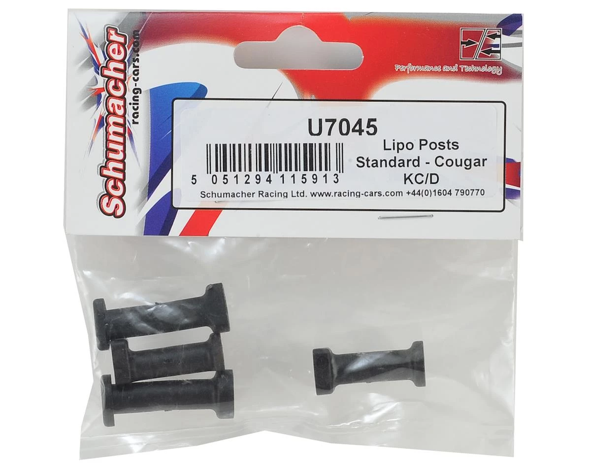 Schumacher CAT XLS Standard LiPo Posts. These replacement battery plate standoff posts are also compatible with the Cougar KC and Cougar D models. Package includes four standoff posts.