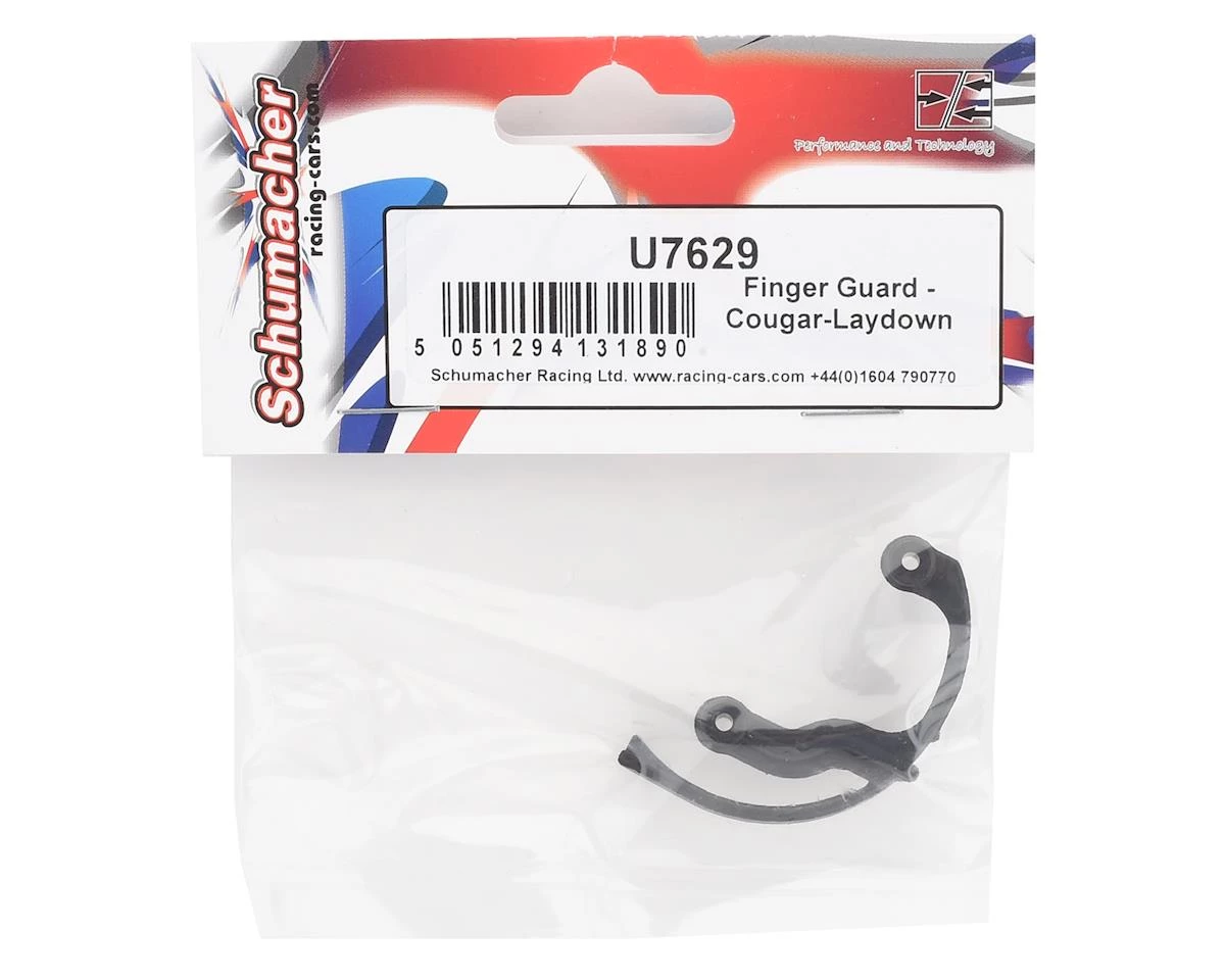 The Schumacher Cougar Laydown Finger Guard package includes one replacement finger guard compatible with the Cougar Laydown buggy.