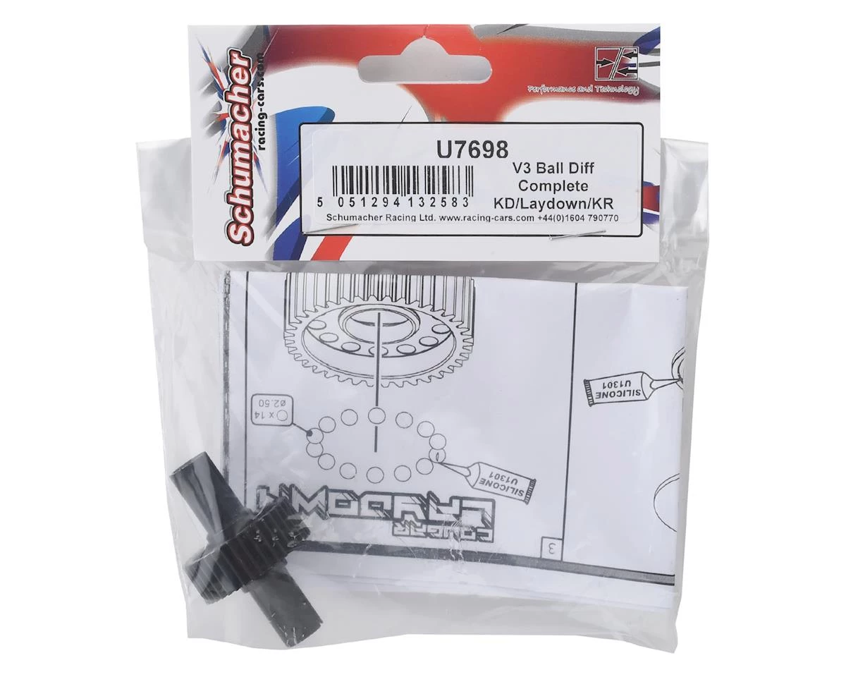 This is an optional Schumacher V3 Complete Ball Differential, intended for use with the Cougar Laydown, KD and KR models. This part is made with a traditional design that uses a spring and T nut to apply tension. This part is a revised and improved ball diff that is simple to assemble with a smoother action than the stock part.