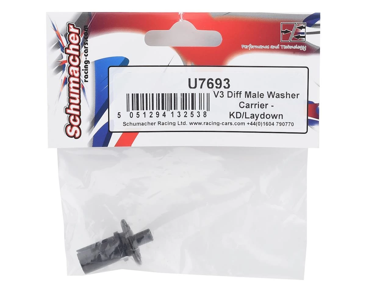 The Schumacher Cougar Laydown KD V3 Differential Male Washer Carrier, is intended for use with the Cougar Laydown KD and KR models equipped with the V3 differential.