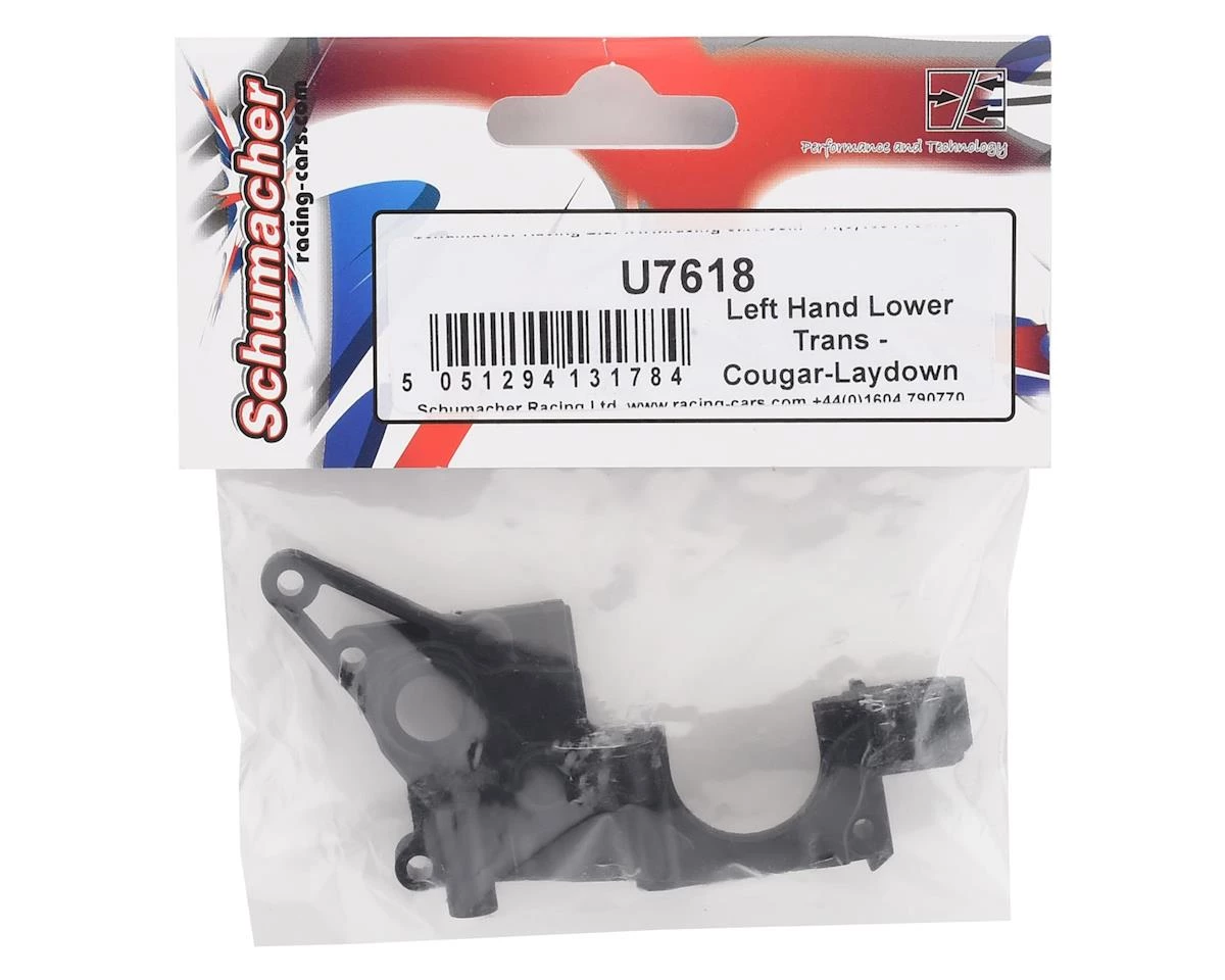 This Schumacher Left Hand Lower Transmission Case is intended as a replacement for use with the Cougar Laydown 2WD 1/10 electric buggy kit.