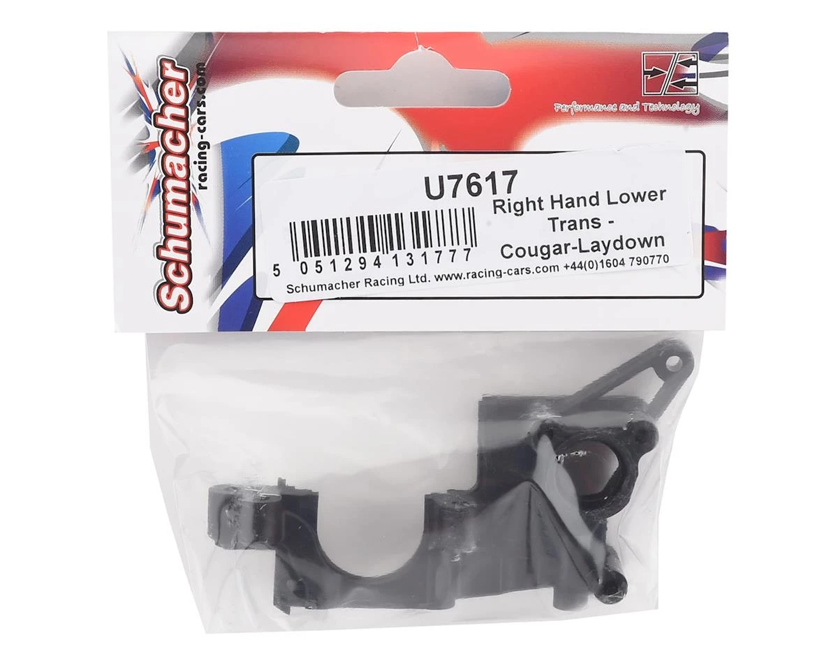 This Schumacher Right Hand Lower Transmission Case is intended as a replacement for use with the Cougar Laydown 2WD 1/10 electric buggy kit.