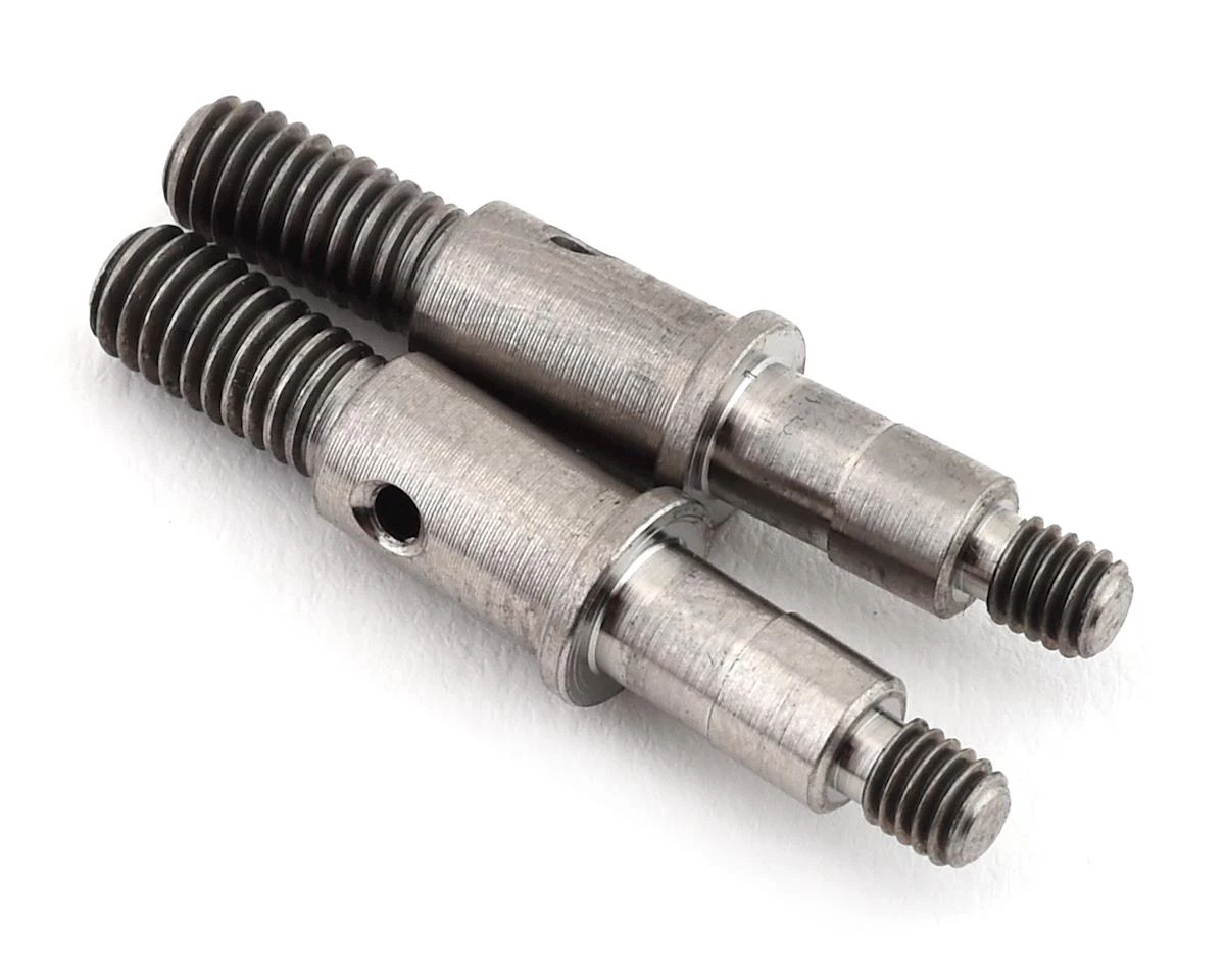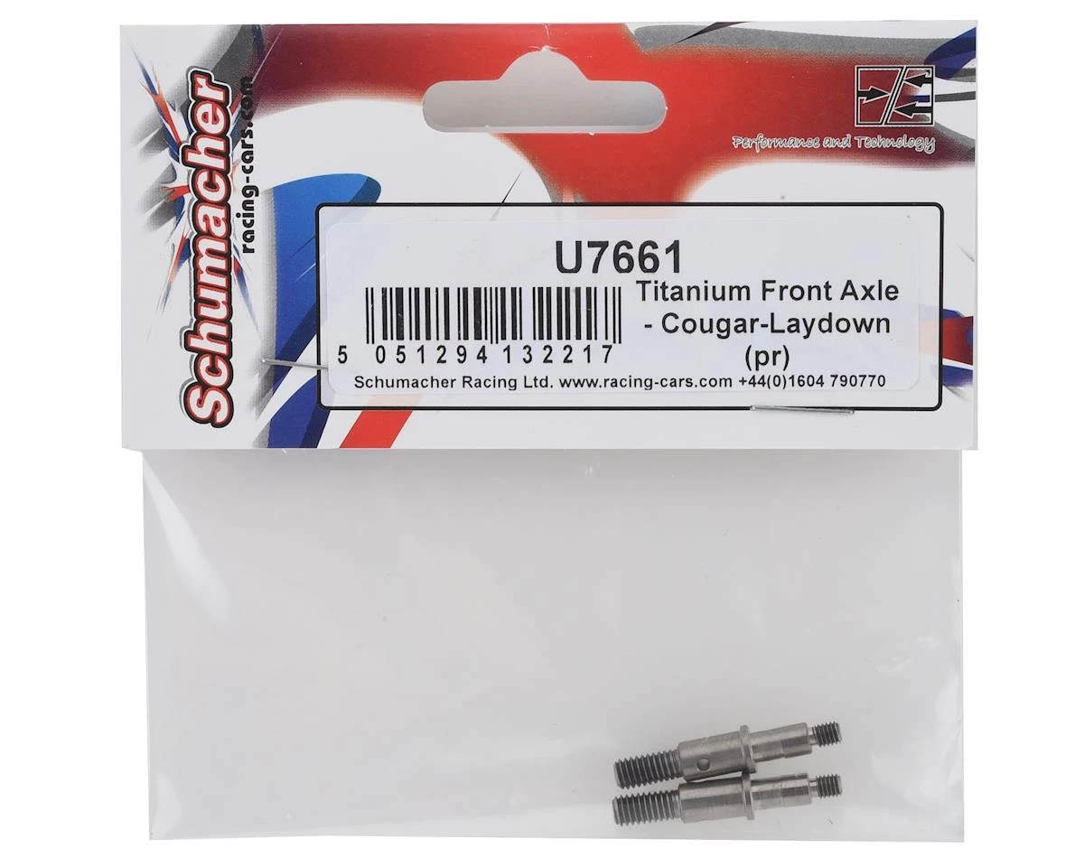 This is an optional pack of Schumacher Cougar Laydown Titanium Front Axles, intended for use with the Cougar Laydown kit. This pack includes two titanium front axles.