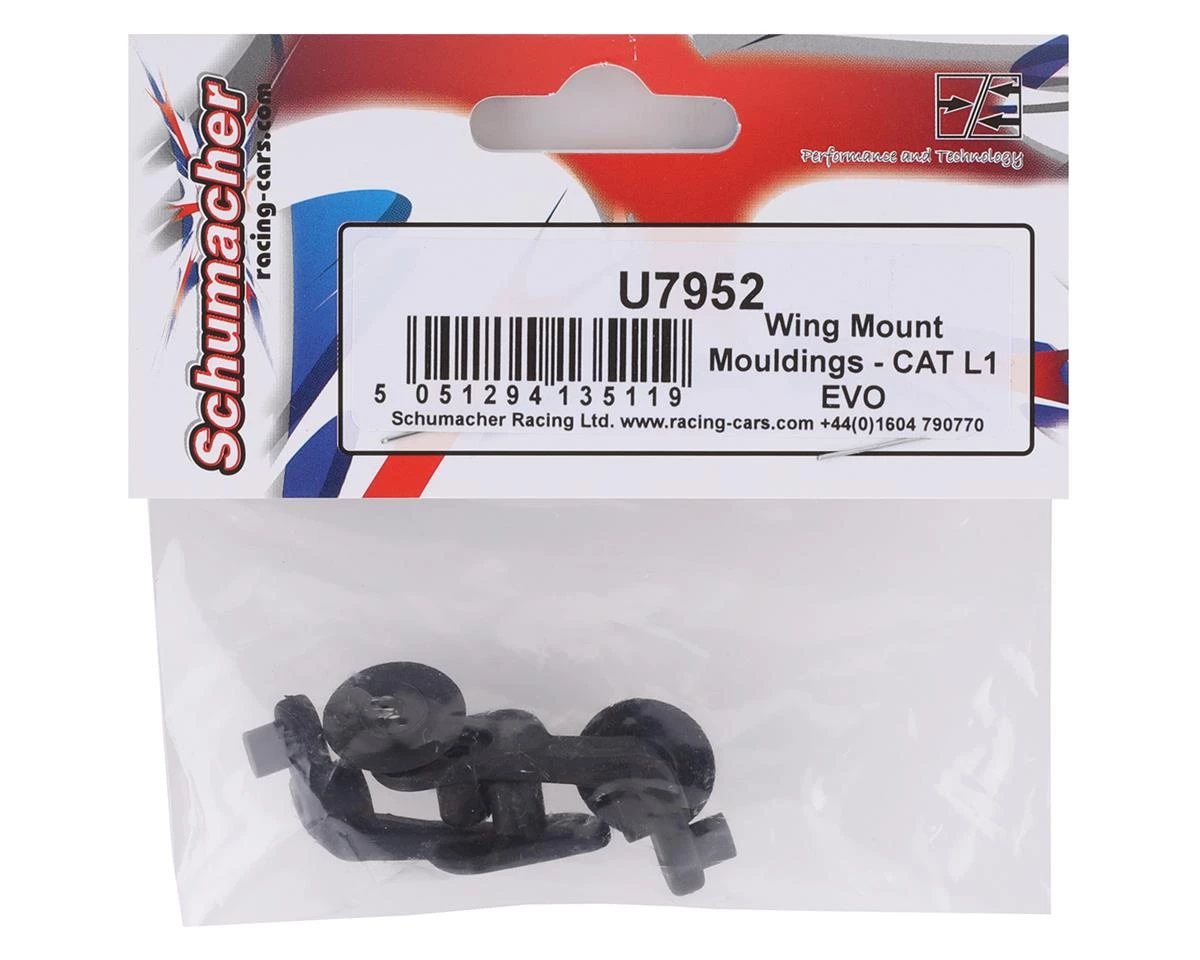 Schumacher Cougar LD2/CAT K1 Wing Mount Moldings. These replacement wing moldings are intended for the Schumacher Cougar LD2 and CAT K1 buggies. Package includes left and right wing mounts and two wing buttons.