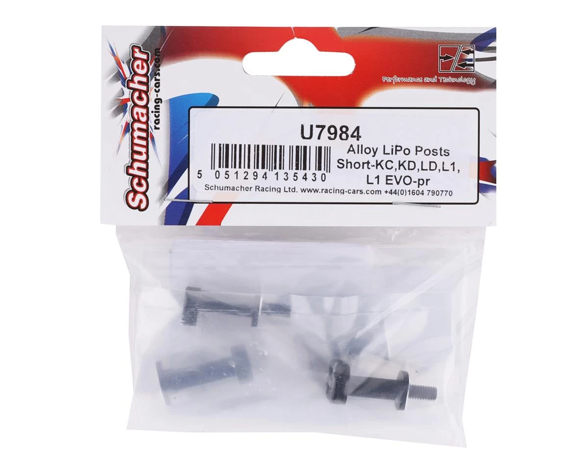 Schumacher Cougar/Storm Alloy LiPo Posts. These optional LiPo posts are intended for the Schumacher Cougar Laydown, Cougar KD, Cougar LD2 and the Storm ST. Package includes four LiPo posts.