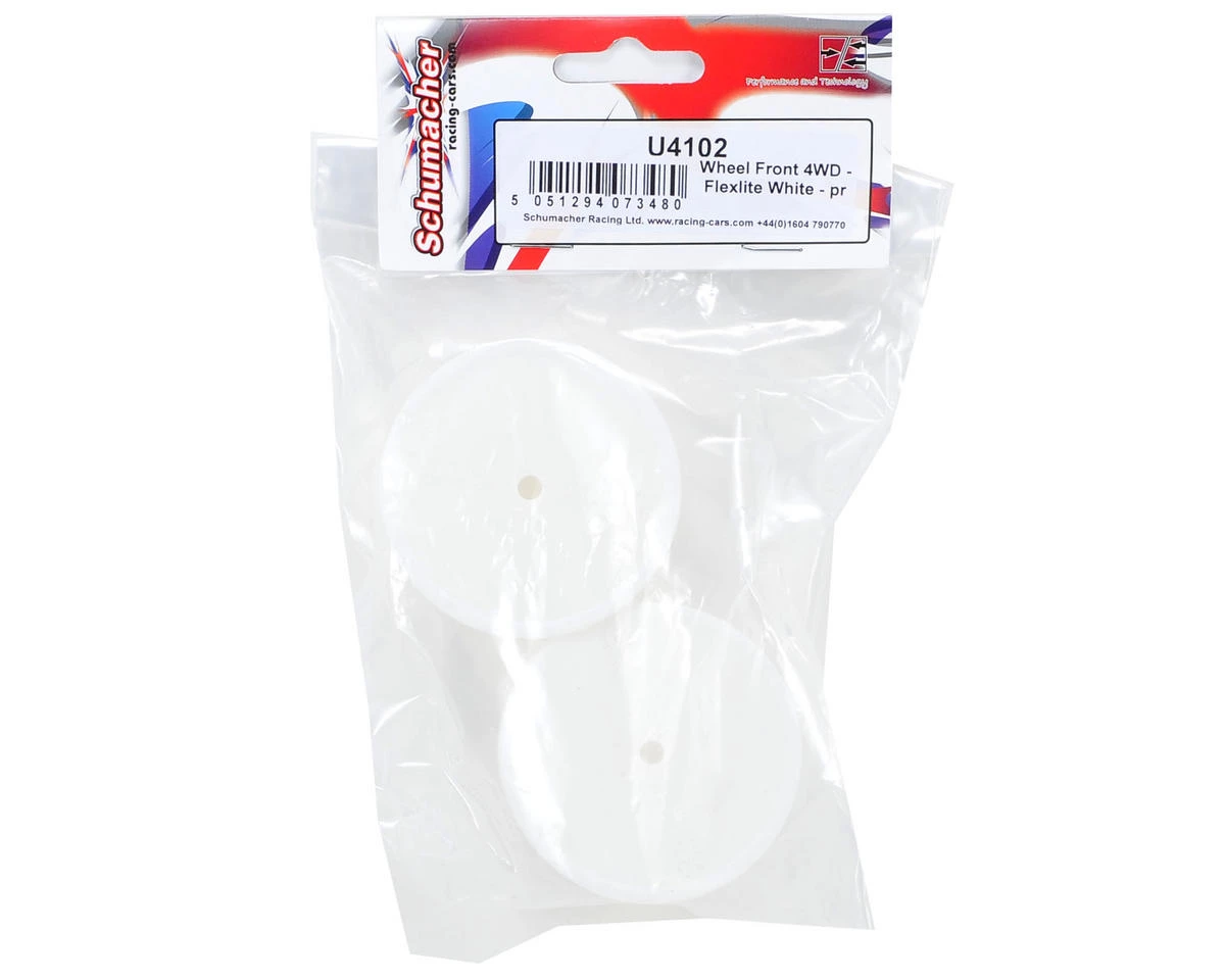This is a pack of two Schumacher “Flexlite” Front Wheels, and are intended for use with 1/10 scale 4WD buggies. After extensive testing with various materials, the Schumacher team is happy to offer their Flexlite buggy wheel which features improved impact resistance and durability. The Flexlite wheel is also extremely lightweight and can also be identified by its brighter whiter color.