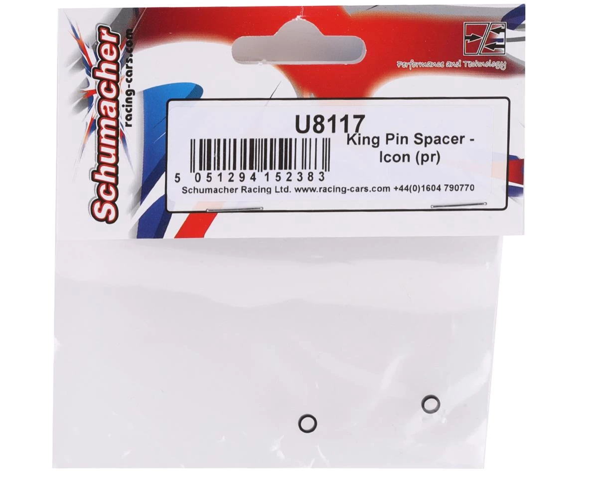 This is a replacement set of two Schumacher Icon King Pin Spacers, intended for use with the Icon 1/10 Competition Formula F1 Chassis Kit.