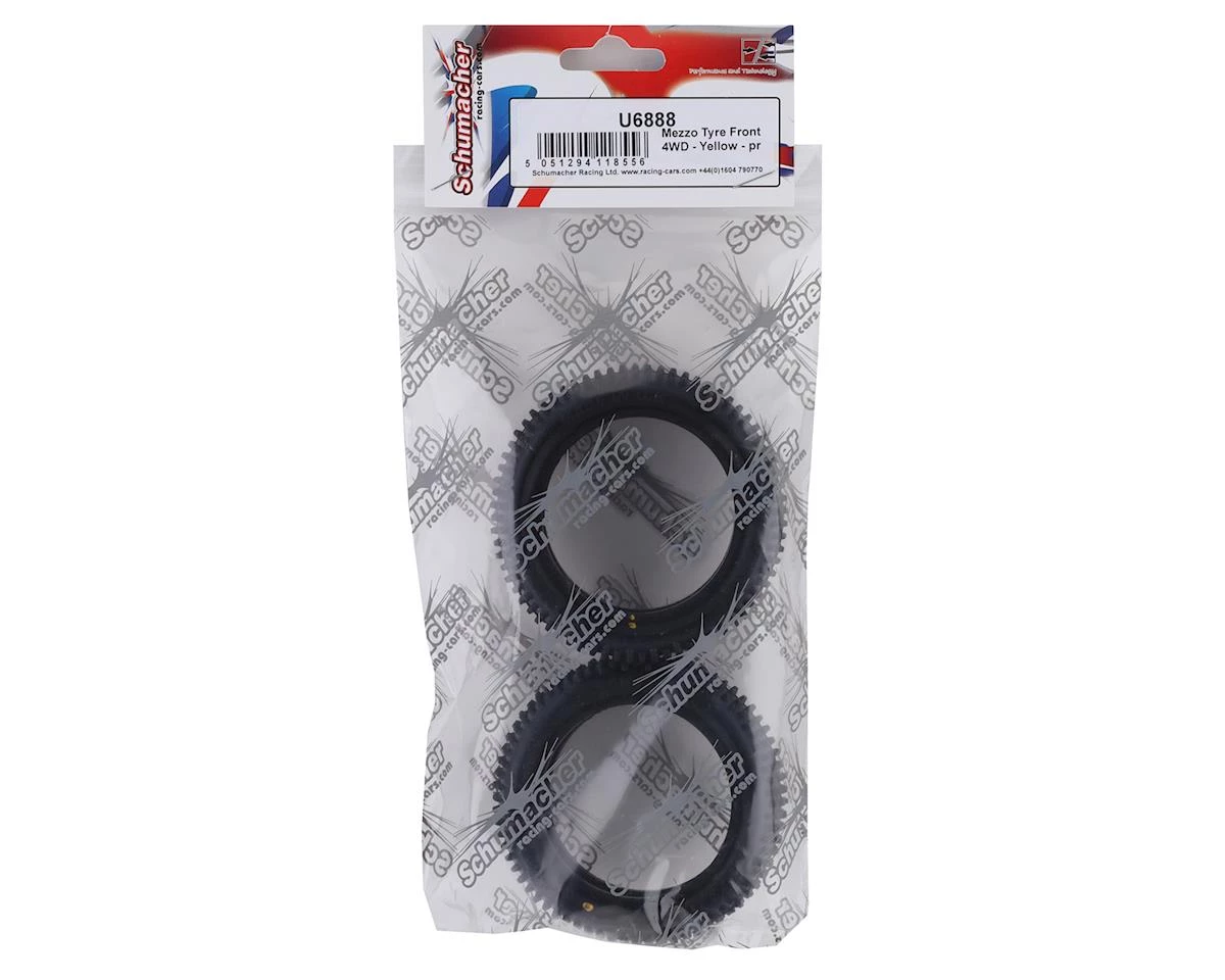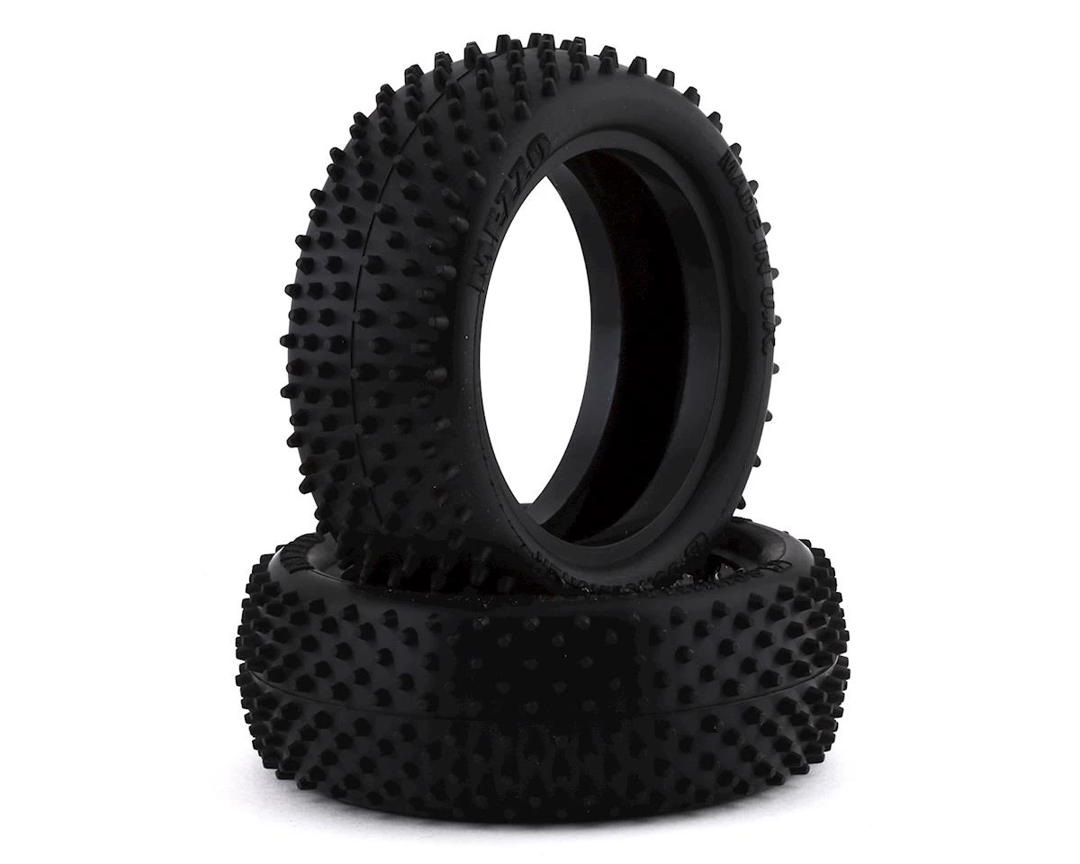 Schumacher Mezzo 1/10 4WD Buggy Front Tires feature a completely redesigned carcass, with development focused on the thickness of the profile to support the pin and improve the life span. The Mezzo has a varied pin type across the tire, enabling it to be more suitable to a wider variety of track conditions, including long and short pile astro. The pin type gives improved side traction whilst maintaining forward traction. Also, the Mezzo lasts longer and provides great bump handling thanks to the taller sidewall profile.