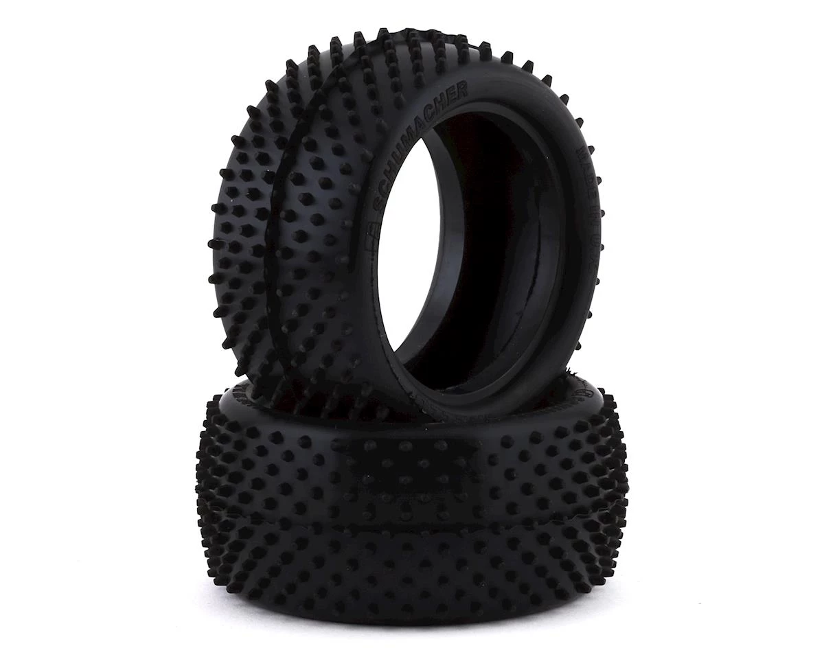 Schumacher Mezzo 1/10 Buggy Rear Tires feature a completely redesigned carcass, with development focused on the thickness of the profile to support the pin and improve the life span. The Mezzo has a varied pin type across the tire, enabling it to be more suitable to a wider variety of track conditions, including long and short pile astro. The pin type gives improved side traction whilst maintaining forward traction. Also, the Mezzo lasts longer and provides great bump handling thanks to the taller sidewall profile.