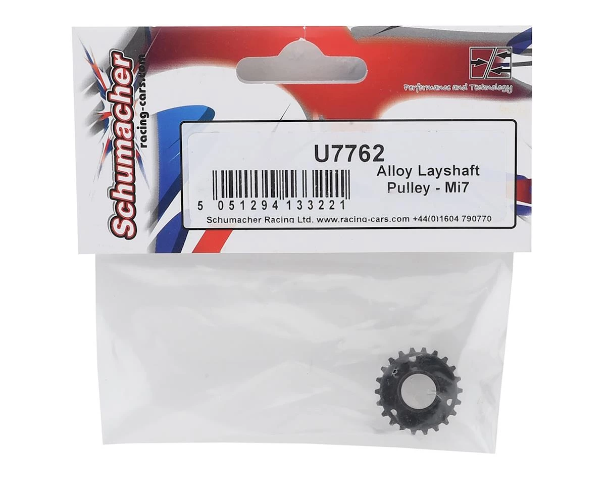 This is a replacement Schumacher Alloy Layshaft Pulley, intended for use with the Mi7 Pro 1/10 Carbon Fiber Electric On-Road Touring Car Kit.