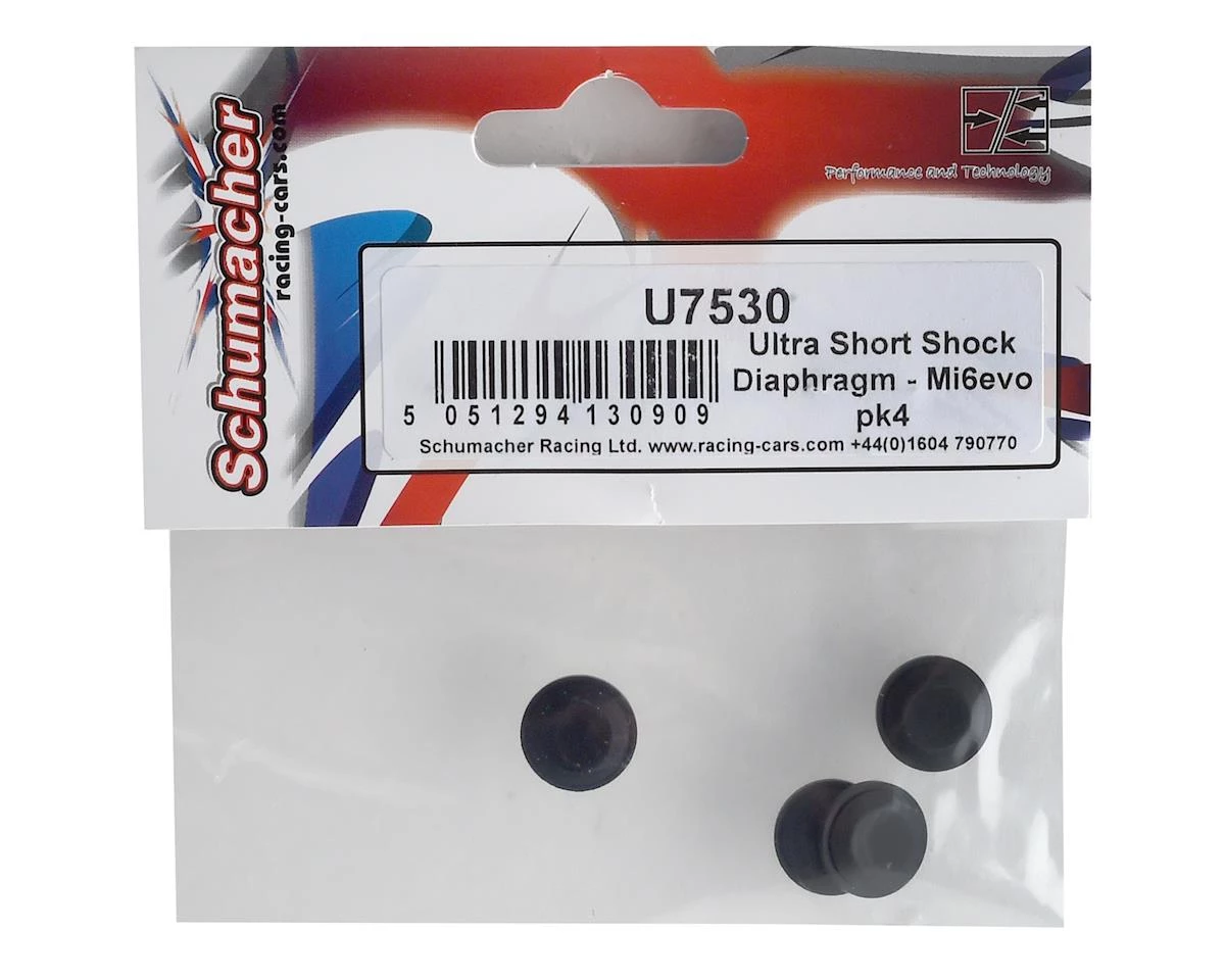 This is a replacement pack of four Schumacher Ultra Short Shock Diaphragms, intended for use with the Mi7 Pro 1/10 Carbon Fiber Electric On-Road Touring Car Kit.