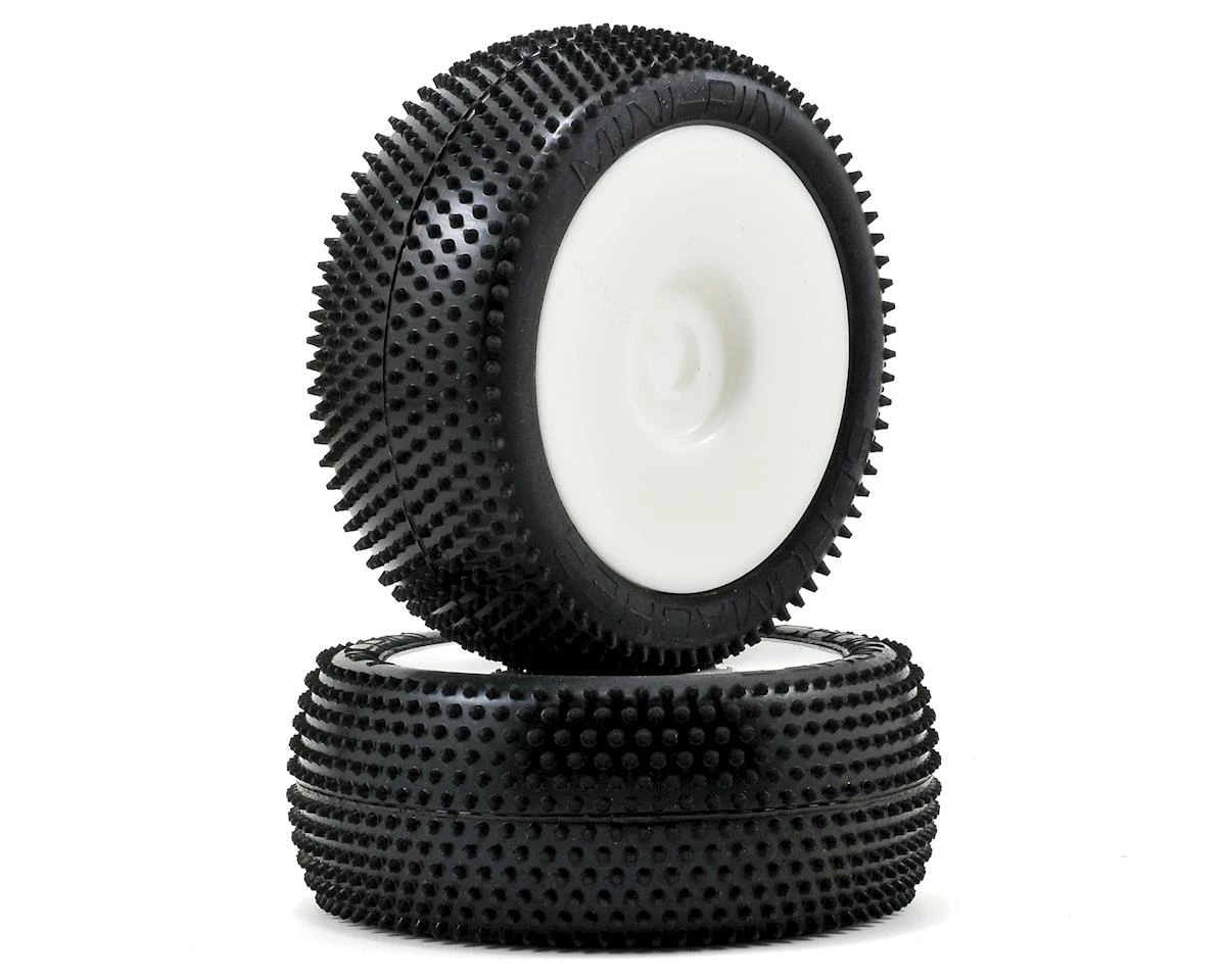 This is a set of two Schumacher “Mini Pin” 1/8 Buggy Tires. These tires have been pre-mounted on white dish wheels. The Mini Pin is suitable for degraded surfaces such as grass/soil mix, dirt and astro turf. These have been pre-mounted on white dish wheels.