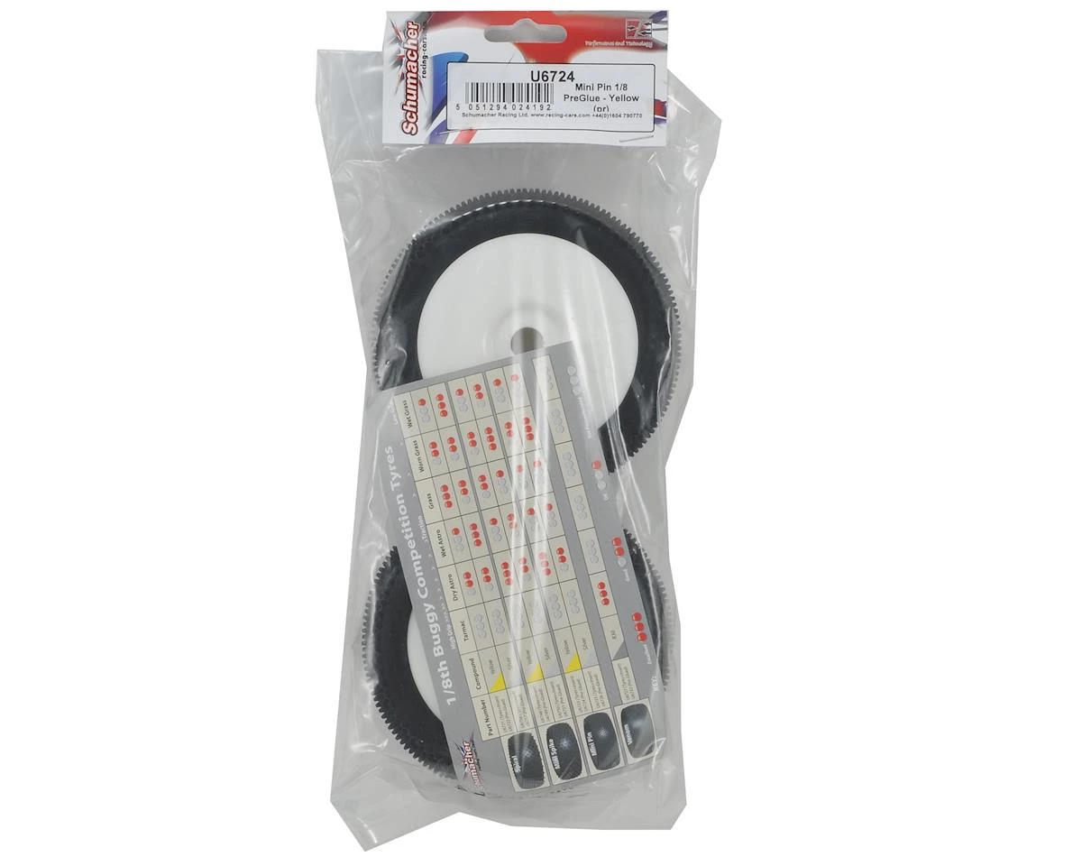 These Schumacher Mini Pin tires are perfect for my 1/8 buggy! The pre-mounted feature saves so much time, and the white and yellow color combo looks fantastic on the track.