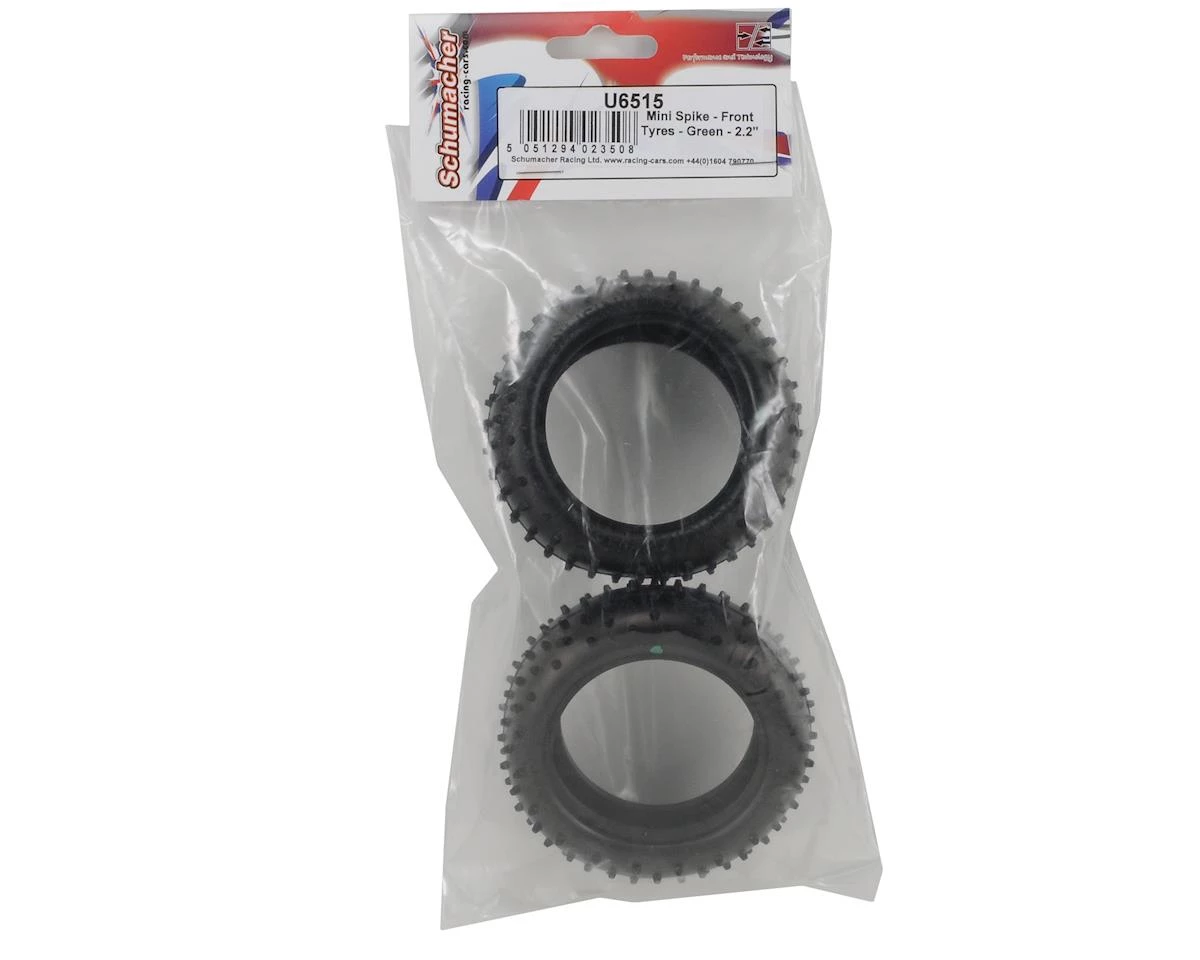 This is a set of two Schumacher “Mini Spike 2” 2.2 1/10 4WD Buggy Front Tires. The Schumacher Mini Spike 2 tire is the control tire used for a majority of races in the UK, making it an excellent choice for a variety of outdoor track conditions.