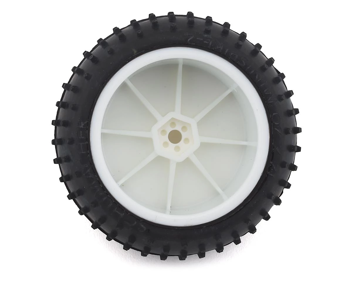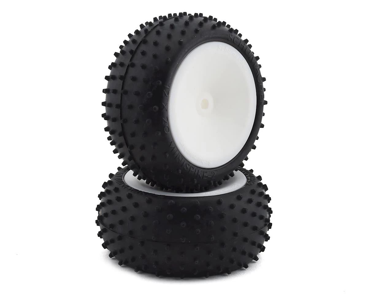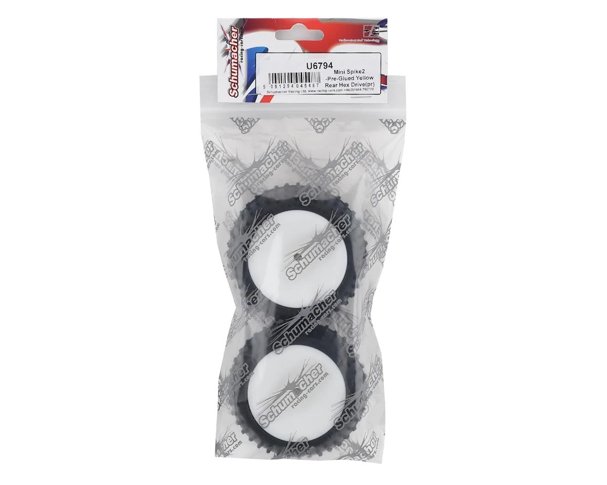 This is a pack of two Schumacher Mini Spike 2 Pre-Mounted 1/10 Buggy Rear Tires. The Schumacher Mini Spike 2 tire is the control tire used for a majority of races in the UK, making it an excellent choice for a variety of outdoor track conditions.