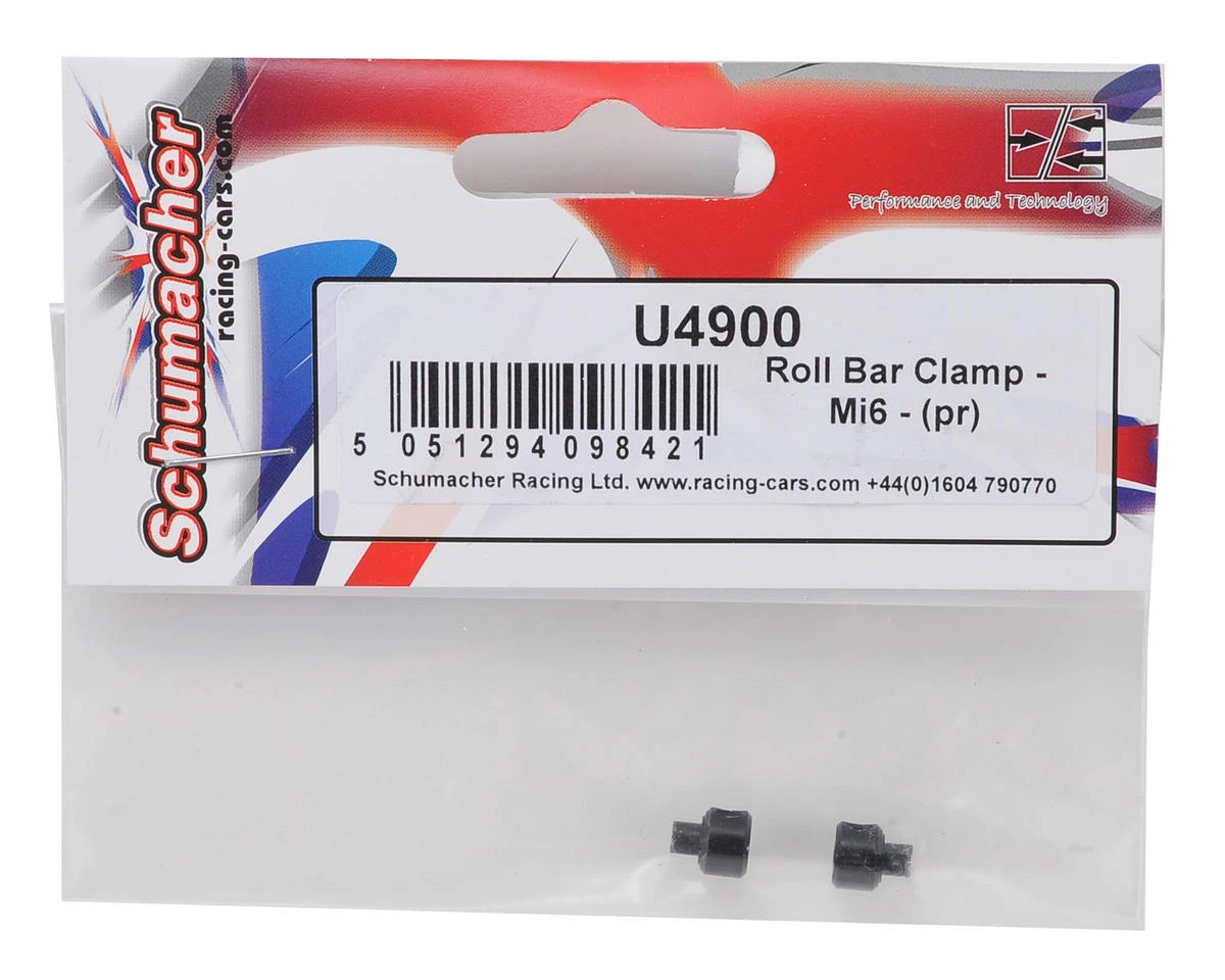 This is a pack of two replacement Schumacher Roll Bar Clamps for the Mi6 1/10 Touring Car.