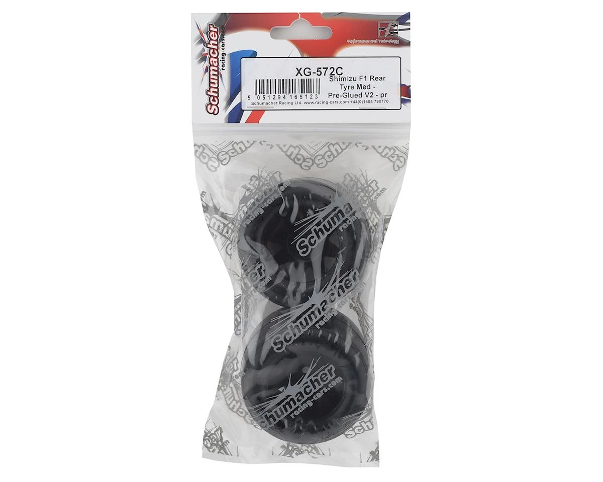 This is a set of Schumacher Shimizu F1 Rear Pre-Glued V2 Tires. These V2 spec tires are pre-mounted on CRC wheels and are best suited to carpet racing applications. Choose from medium and soft compounds using the pull down menu above.