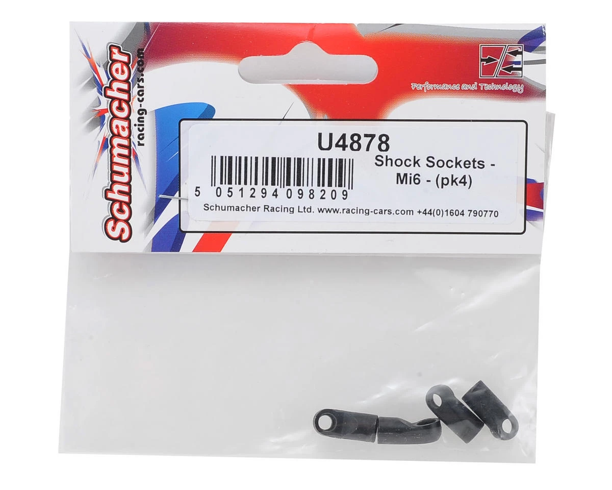 Schumacher Shock Sockets. Package includes four replacement Mi6 shock sockets.