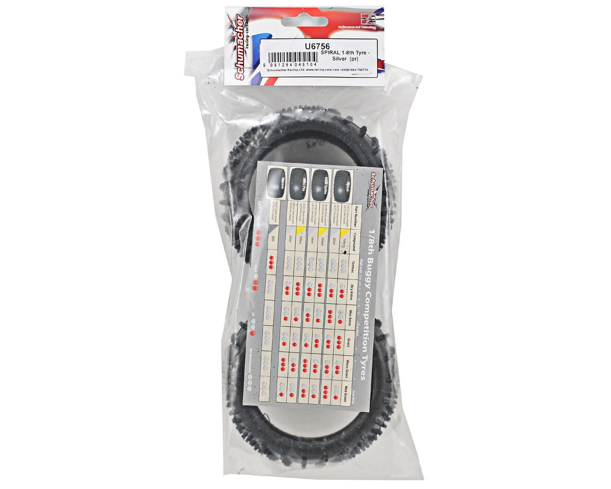 This is a set of two Schumacher “Spiral” 1/8 Buggy Tires. The Spiral tire was designed for surfaces that need more penetration of the ground to gain grip, like grass and loose dirt. Spiral tires feature large pins, in a directional ‘spiral’ pattern that spaces the pins closer together on one side of the tire, and farther apart on the other side. This design allows you to alter the lateral grip characteristics of the tire, without affecting the forward bite. This is done by changing which side of the tire is mounted to the outside of the rim. With the close spaced pins on the outside, the tires will offer the most lateral grip they can produce. With the far spaced pins on the outside, it will reduce lateral grip.