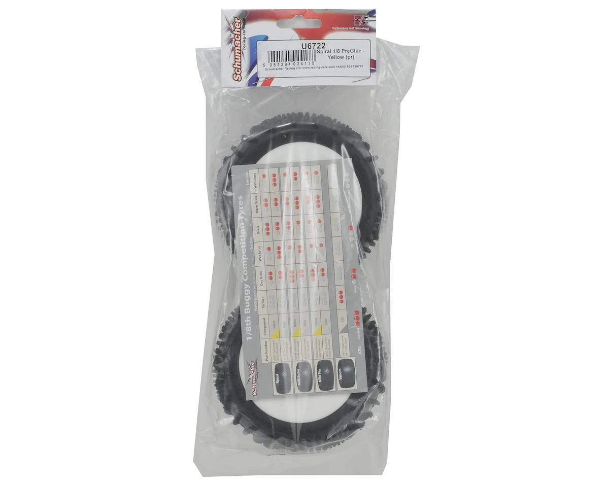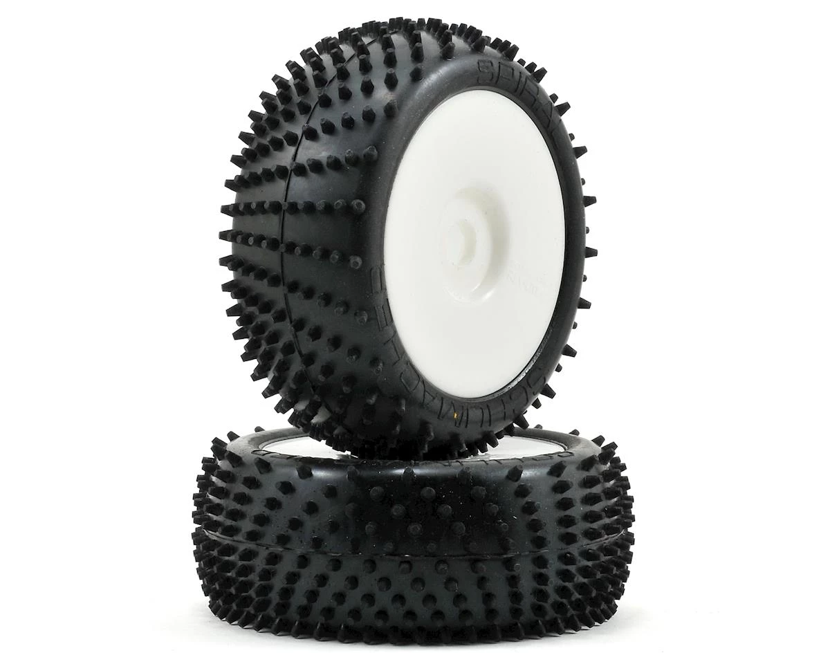 This is a set of two Schumacher “Spiral” 1/8 Buggy Tires. These tires have been pre-mounted on white dish wheels. The Spiral tire was designed for surfaces that need more penetration of the ground to gain grip, like grass and loose dirt. Spiral tires feature large pins, in a directional ‘spiral’ pattern that spaces the pins closer together on one side of the tire, and farther apart on the other side.