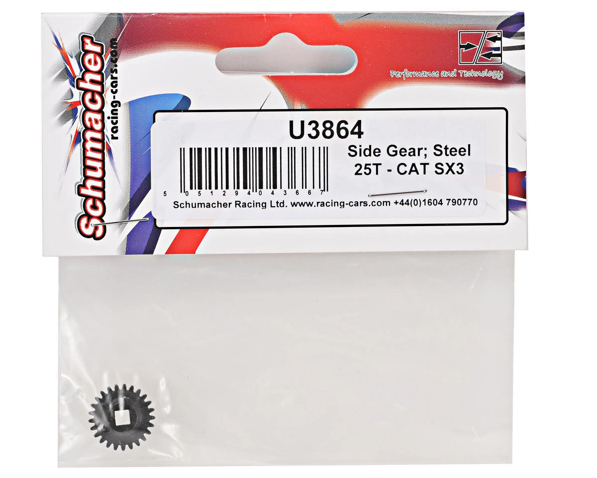 This is a Schumacher 25 Tooth Steel Side Gear, and is intended for use with the Schumacher Cat SX3.
