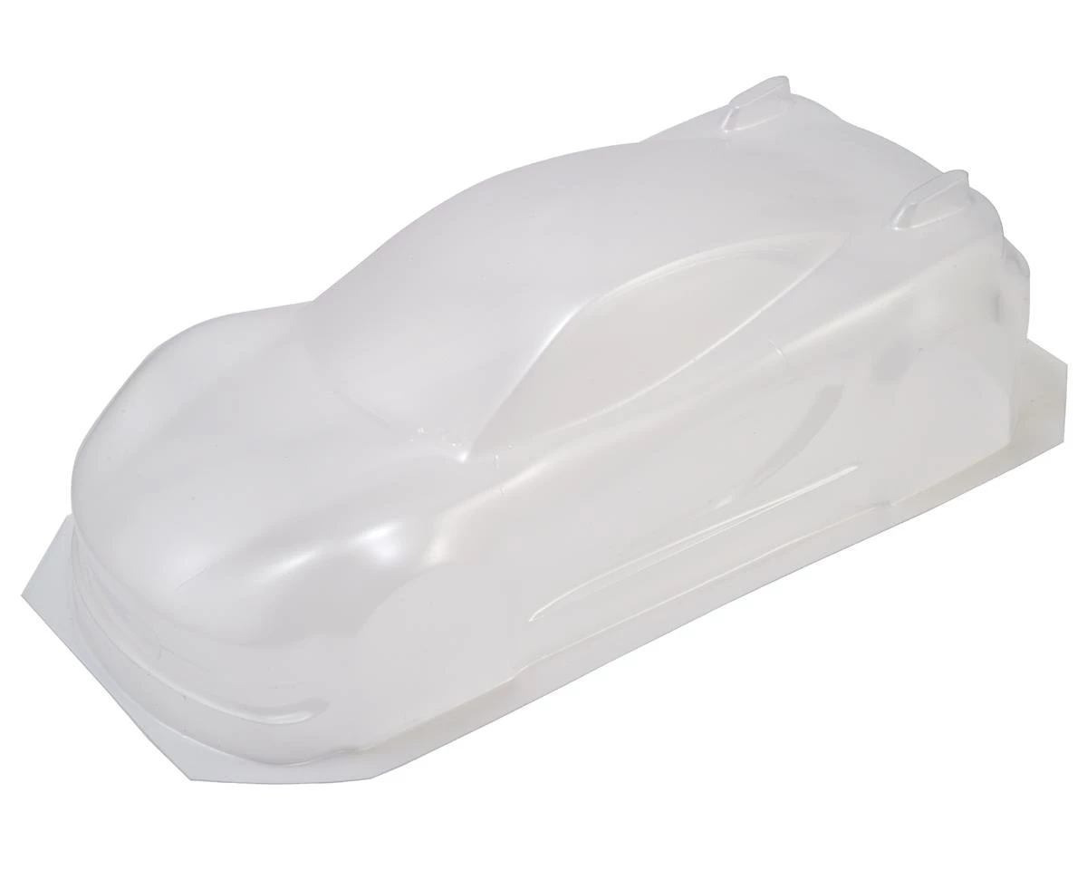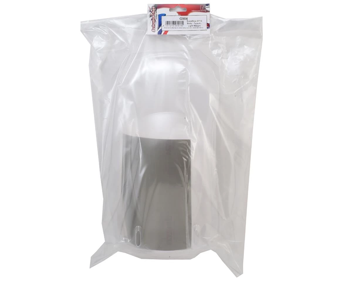 This is the Schumacher SupaStox GT12 “Type A” Body in Clear Lexan material. This body is the lightweight version, and requires polycarbonate paint and trimming.