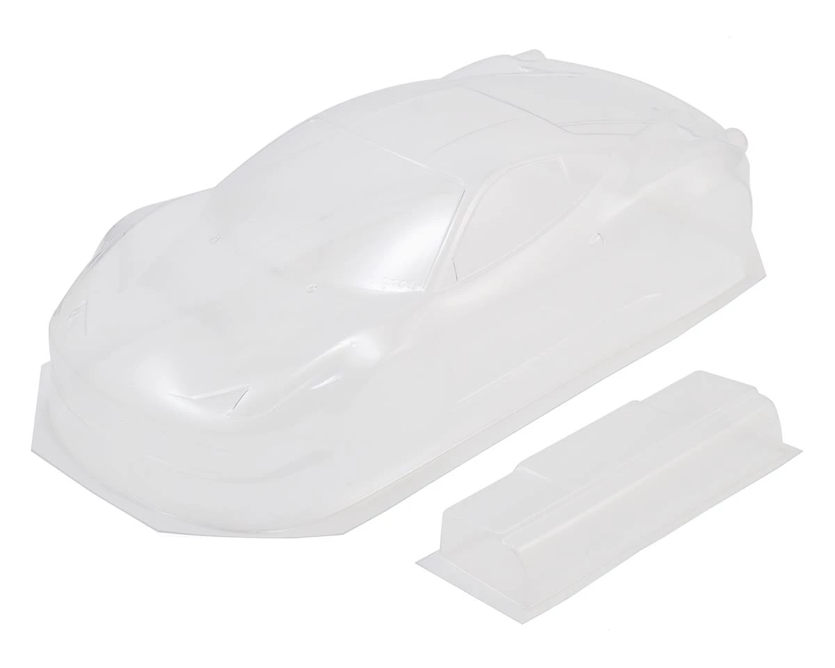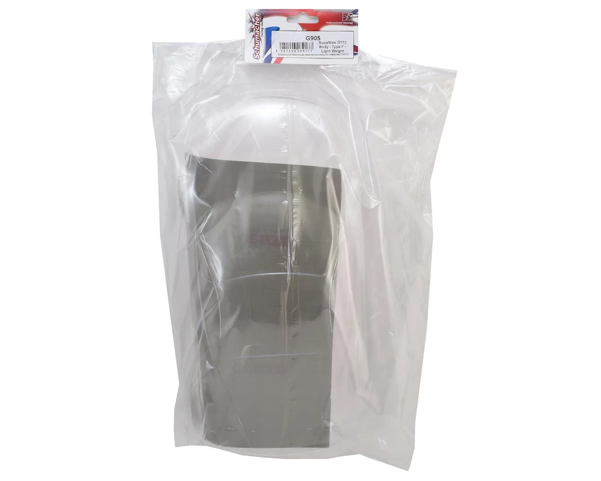 This is the Schumacher SupaStox GT12 “Type F” Clear Body. This is the Light Weight version and requires polycarbonate paint and trimming.