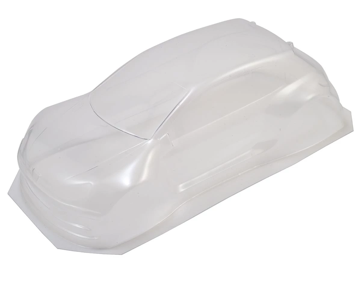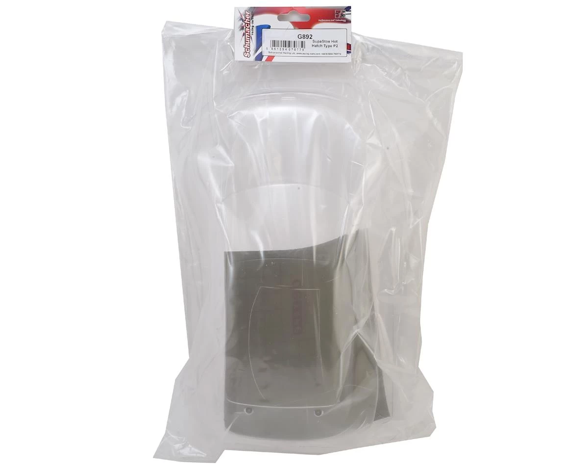 This is the Schumacher “Type P2” SupaStox Hot Hatch 1/12 Body in Clear Lexan. This body is clear and requires trimming and painting. Also included are window masks and a wing.
