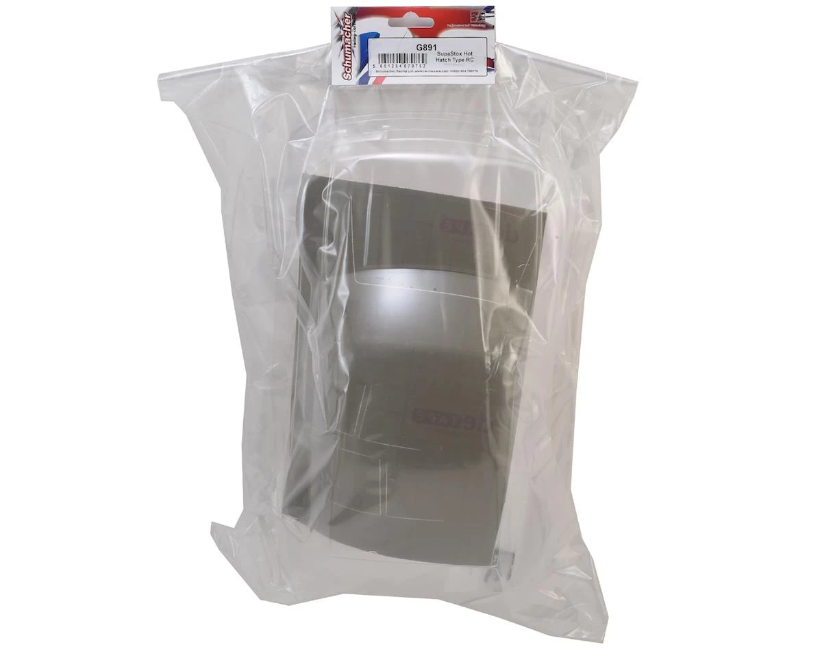 This is the Schumacher “Type RC” SupaStox Hot Hatch 1/12 Pan Car Body in Clear Lexan. This body requires polycarbonate paint and trimming, but includes wing, window masks and wing mounting hardware.