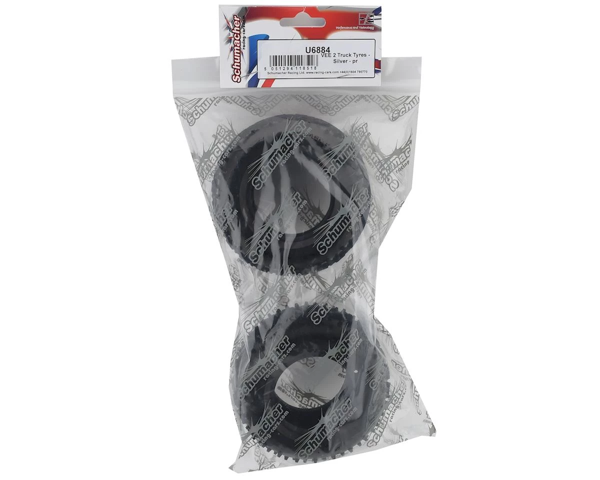 This set of Schumacher Silver Compound VEE 2 Truck Tires, an ideal tuning option for wet astro conditions.